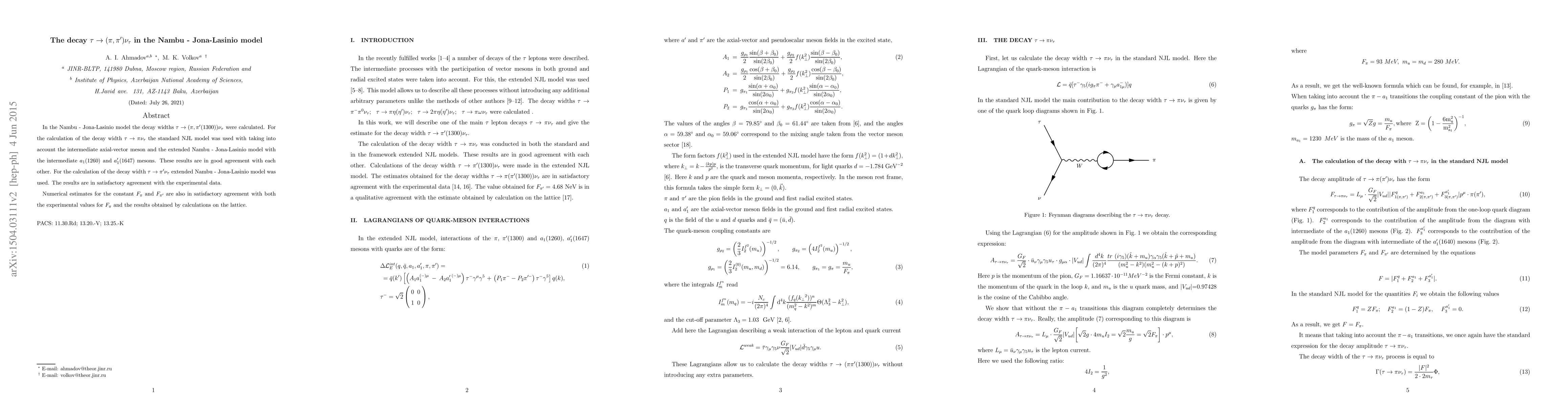 This paper calculates decay widths for the decay $\tau \to (\pi, \pi') \nu_{\tau}$ using the Nambu-Jona-Lasinio model, showing good agreement between the standard and extended models for $\tau \to \pi \nu_{\tau}$ and satisfactory agreement with experimental data for $\tau \to \pi' \nu_{\tau}$. Numerical estimates for $F_{\pi}$ and $F_{\pi'}$ align well with experimental and lattice calculation results.