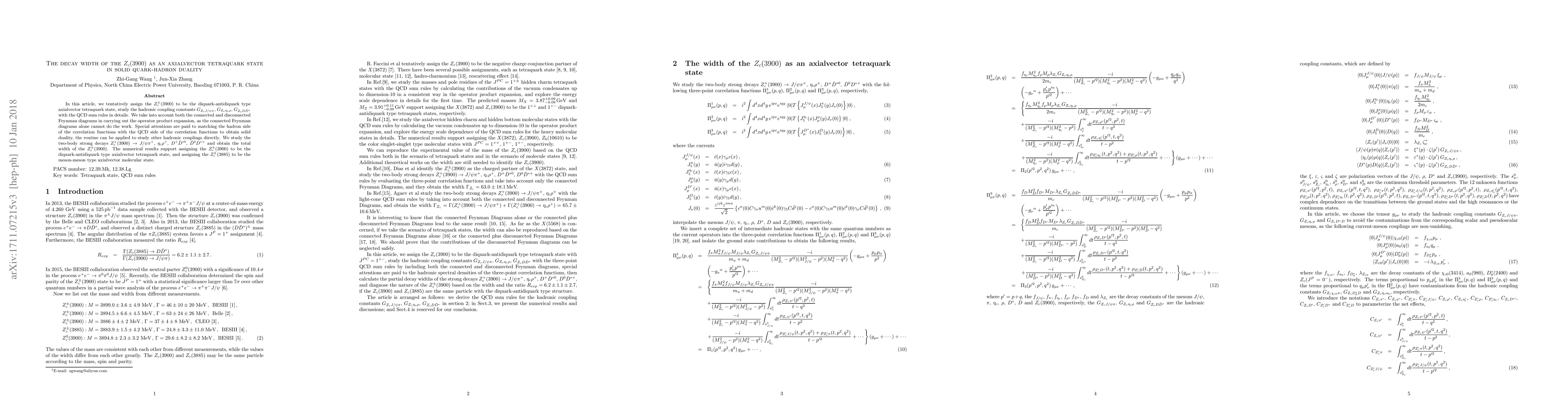 In this article, we tentatively assign the $Z_c^\pm(3900)$ to be the diquark-antidiquark type axialvector tetraquark state, study the hadronic coupling constants $G_{Z_cJ/\psi\pi}$, $G_{Z_c\eta_c\rho}$, $G_{Z_cD \bar{D}^{*}}$ with the QCD sum rules in details. We take into account both the connected and disconnected Feynman diagrams in carrying out the operator product expansion, as the connected Feynman diagrams alone cannot do the work. Special attentions are paid to matching the hadron side of the correlation functions with the QCD side of the correlation functions to obtain solid duality, the routine can be applied to study other hadronic couplings directly. We study the two-body strong decays $Z_c^+(3900)\to J/\psi\pi^+$, $\eta_c\rho^+$, $D^+ \bar{D}^{*0}$, $\bar{D}^0 D^{*+}$ and obtain the total width of the $Z_c^\pm(3900)$. The numerical results support assigning the $Z_c^\pm(3900)$ to be the diquark-antidiquark type axialvector tetraquark state, and assigning the $Z_c^\pm(3885)$ to be the meson-meson type axialvector molecular state.