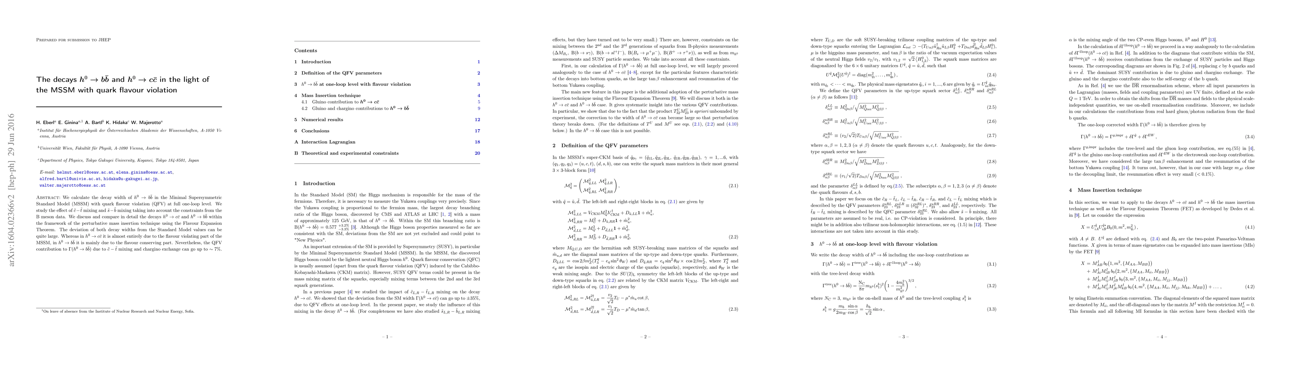 We calculate the decay width of h0 -> b bbar in the Minimal Supersymmetric Standard Model (MSSM) with quark flavour violation (QFV) at full one-loop level. We study the effect of scharm-stop mixing and sstrange-sbottom mixing taking into account the constraints from the B meson data. We discuss and compare in detail the decays h0 -> c cbar and h0 -> b bbar within the framework of the perturbative mass insertion technique using the Flavour Expansion Theorem. The deviation of both decay widths from the Standard Model values can be quite large. Whereas in h0 -> c cbar it is almost entirely due to the flavour violating part of the MSSM, in h0 -> b bbar it is mainly due to the flavour conserving part. Nevertheless, the QFV contribution to Gamma(h0 -> b bbar) due to scharm-stop mixing and chargino exchange can go up to about 8%.