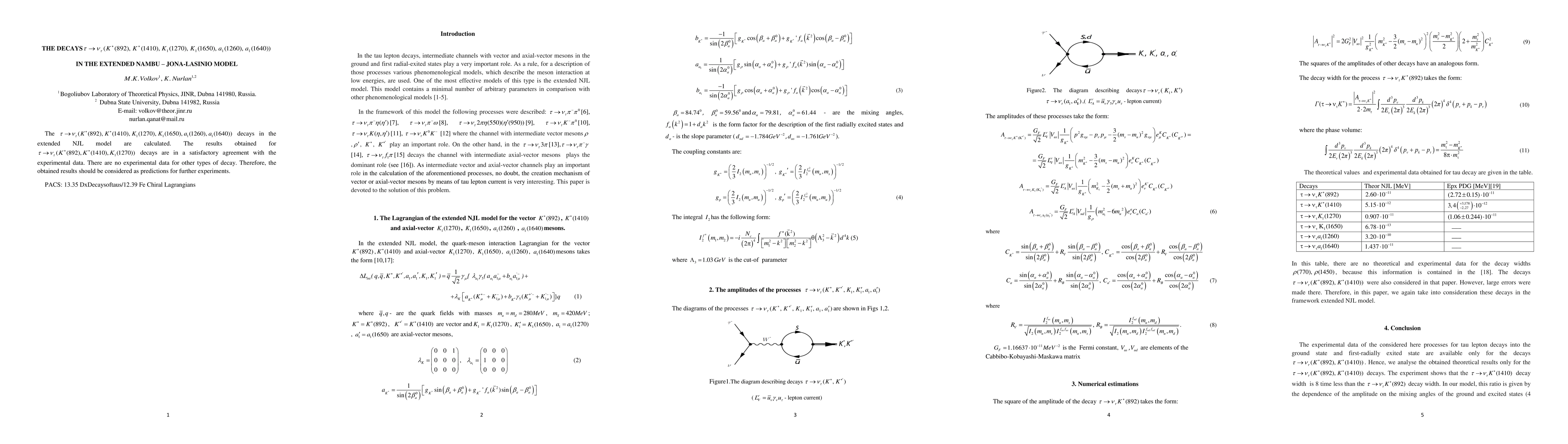 The decays $\tau \to \nu_{\tau} (K^{*}(892), K^{*}(1410), K_1(1270), K_1(1650), a_1(1260), a_1(1640))$ in the extended NJL model are calculated. The results obtained for the decays are $\tau \to \nu_{\tau} (K^{*}(892), K^{*}(1410), K_1(1270))$ in a satisfactory agreement with the experimental data. There are no experimental data for other types of decay. Therefore, the obtained results should be considered as predictions for further experiments.