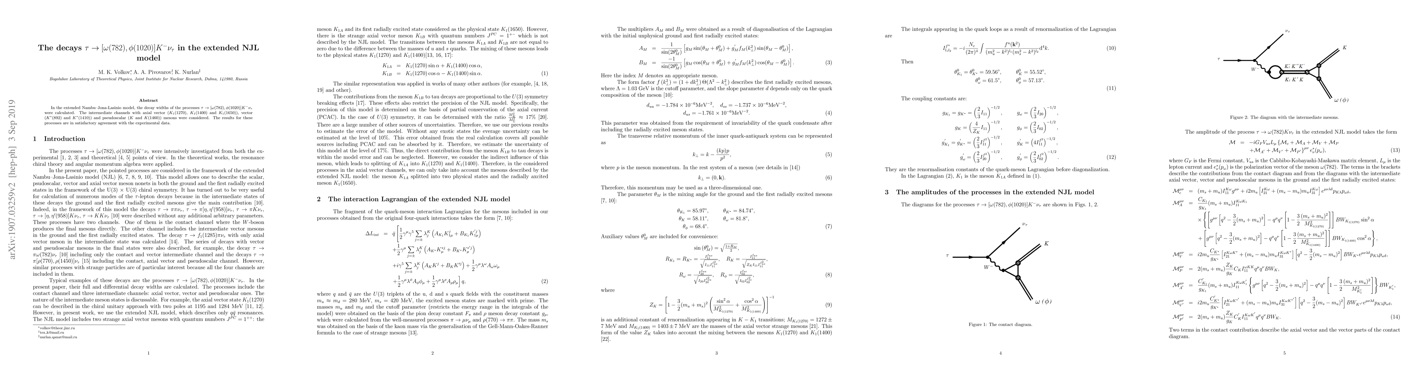 In the extended Nambu--Jona-Lasinio model, the decay widths of the processes $\tau \to [\omega(782), \phi(1020)] K^{-} \nu_{\tau}$ were calculated. The intermediate channels with axial vector ($K_{1}(1270)$, $K_{1}(1400)$ and $K_{1}(1650)$), vector ($K^{*}(892)$ and $K^{*}(1410)$) and pseudoscalar ($K$ and $K(1460)$) mesons were considered. The results for these processes are in satisfactory agreement with the experimental data.