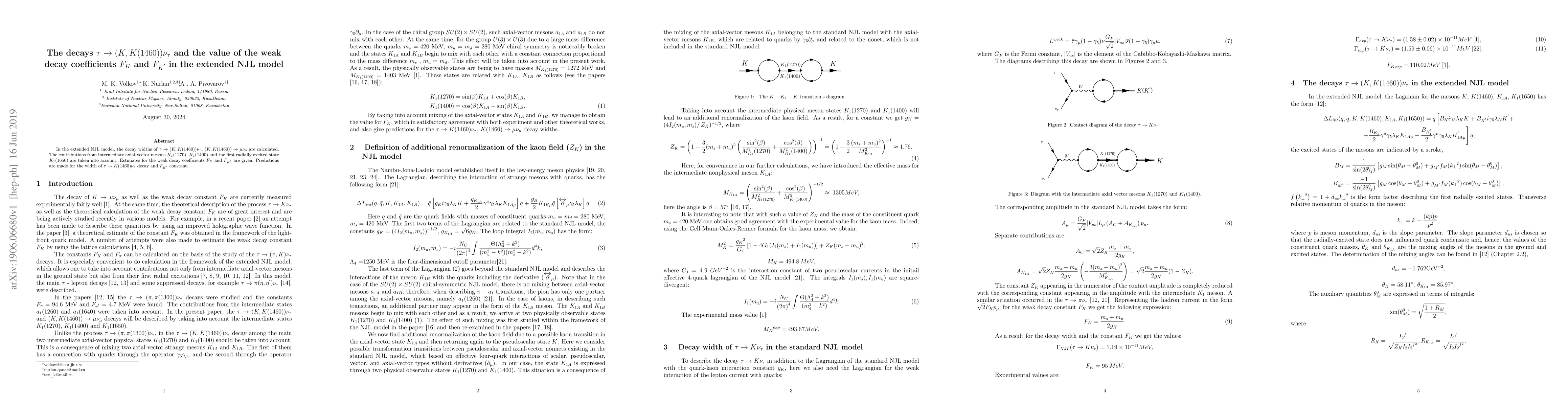 In the extended NJL model, the decay widths of $\tau\rightarrow (K, K(1460))\nu_{\tau}$, $(K, K(1460))\rightarrow {\mu}\nu_{\mu}$ are calculated. The contributions from intermediate axial-vector mesons ${K}_{1}(1270)$, ${K}_{1}(1400)$ and the first radially excited state ${K}_{1}(1650)$ are taken into account. Estimates for the weak decay coefficients ${F}_{K}$ and ${{F}_{{K}^{'}}}$ are given. Predictions are made for the width of $\tau\rightarrow K(1460)\nu_{\tau}$ decay and ${{F}_{{K}^{'}}}$ constant.