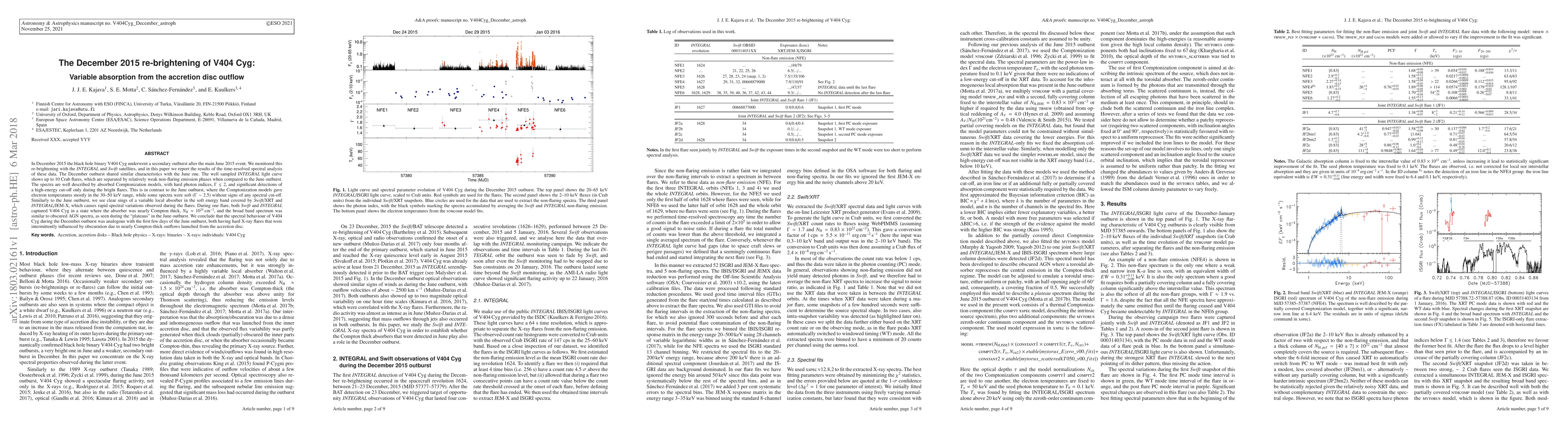 The December 2015 re-brightening of black hole binary V404 Cyg was studied using INTEGRAL and Swift satellite data. Similar to the June 2015 outburst, the December event featured hard X-ray flares intermittently obscured by nearly Compton-thick outflows from the accretion disc, causing rapid spectral variations. The findings suggest a consistent spectral behavior between the two outbursts.