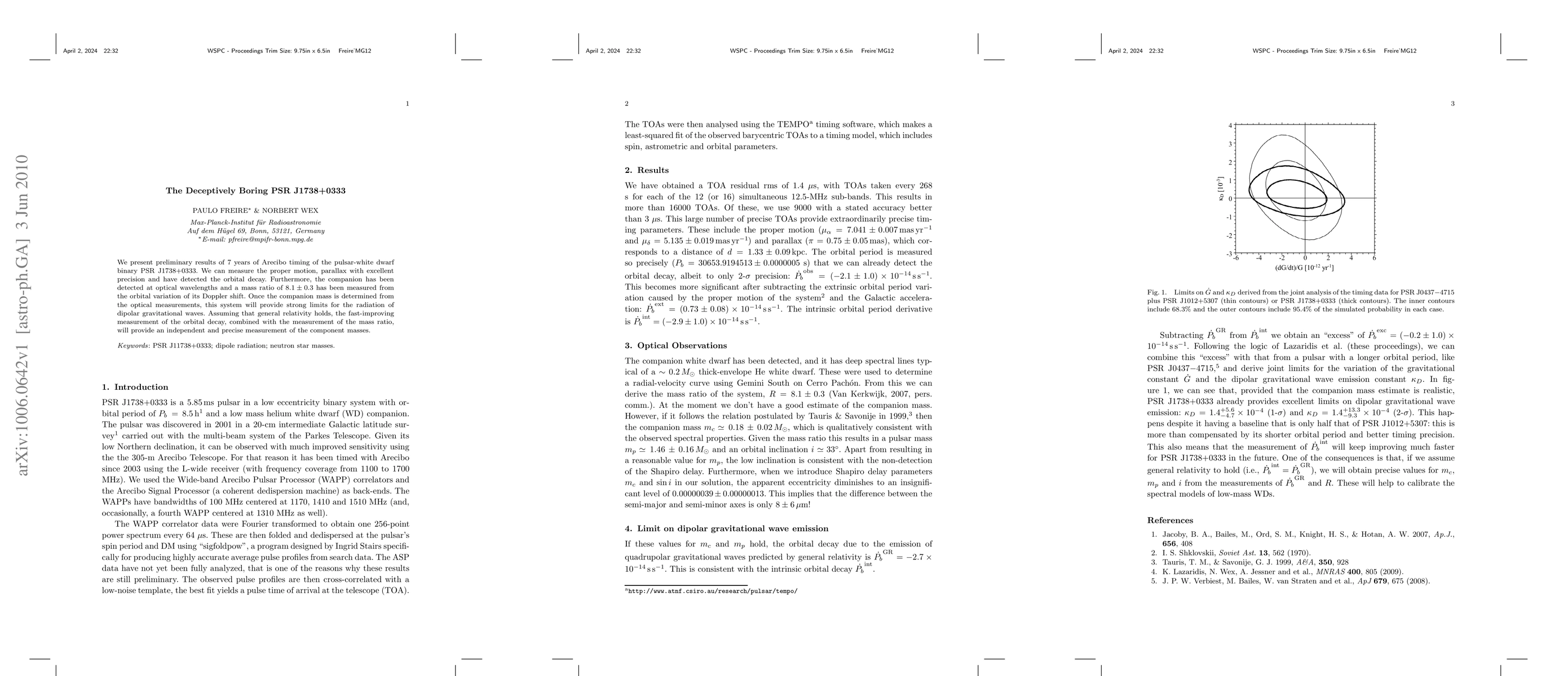 We present preliminary results of 7 years of Arecibo timing of the pulsar-white dwarf binary PSR J1738+0333. We can measure the proper motion, parallax with excellent precision and have detected the orbital decay. Furthermore, the companion has been detected at optical wavelengths and a mass ratio of 8.1 +/- 0.3 has been measured from the orbital variation of its Doppler shift. Once the companion mass is determined from the optical measurements, this system will provide strong limits for the radiation of dipolar gravitational waves. Assuming that general relativity holds, the fast-improving measurement of the orbital decay, combined with the measurement of the mass ratio, will provide an independent and precise measurement of the component masses.