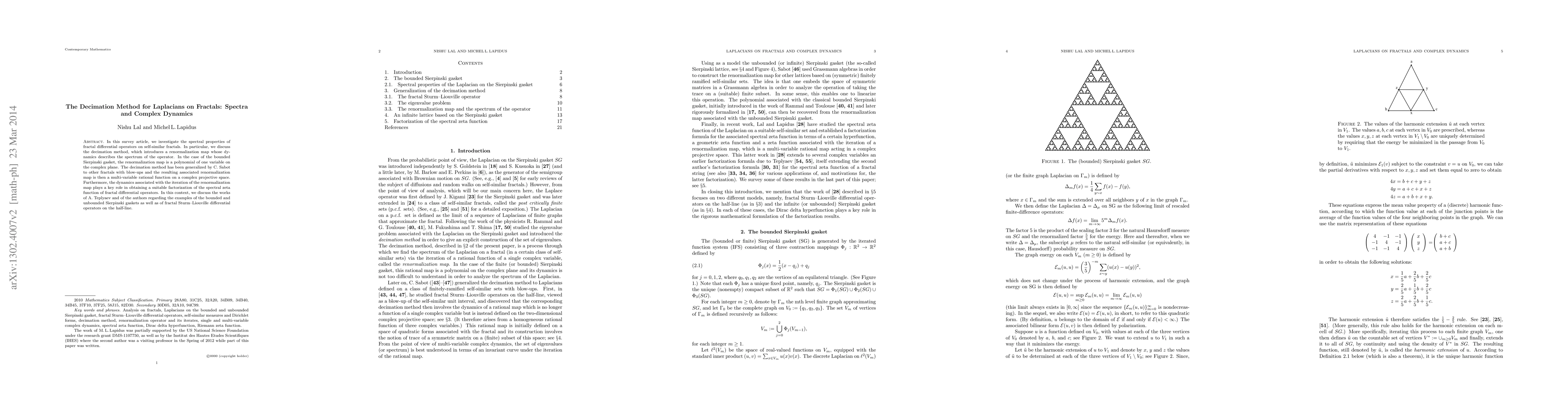 This paper surveys the spectral properties of fractal differential operators using the decimation method, focusing on the renormalization map dynamics that describe the operator's spectrum. The method is generalized to various fractals, with the dynamics playing a crucial role in the factorization of the spectral zeta function.