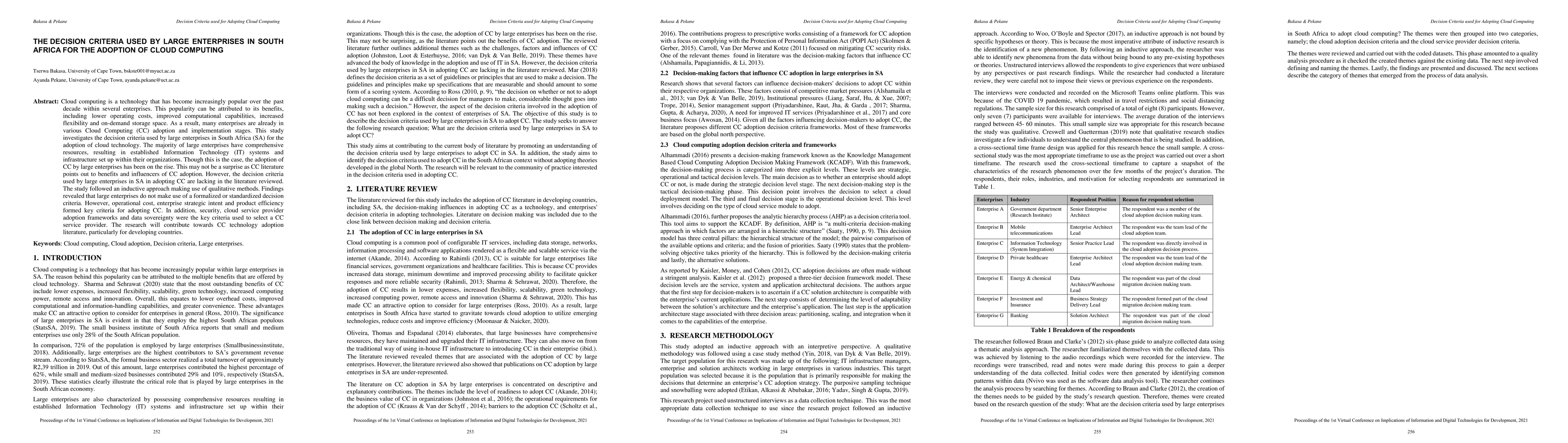 This study investigates the decision criteria used by large enterprises in South Africa for adopting cloud computing, revealing that operational cost, strategic intent, and product efficiency are key factors, while security, provider frameworks, and data sovereignty influence service provider selection. The research highlights a gap in existing literature on cloud adoption criteria in developing countries.