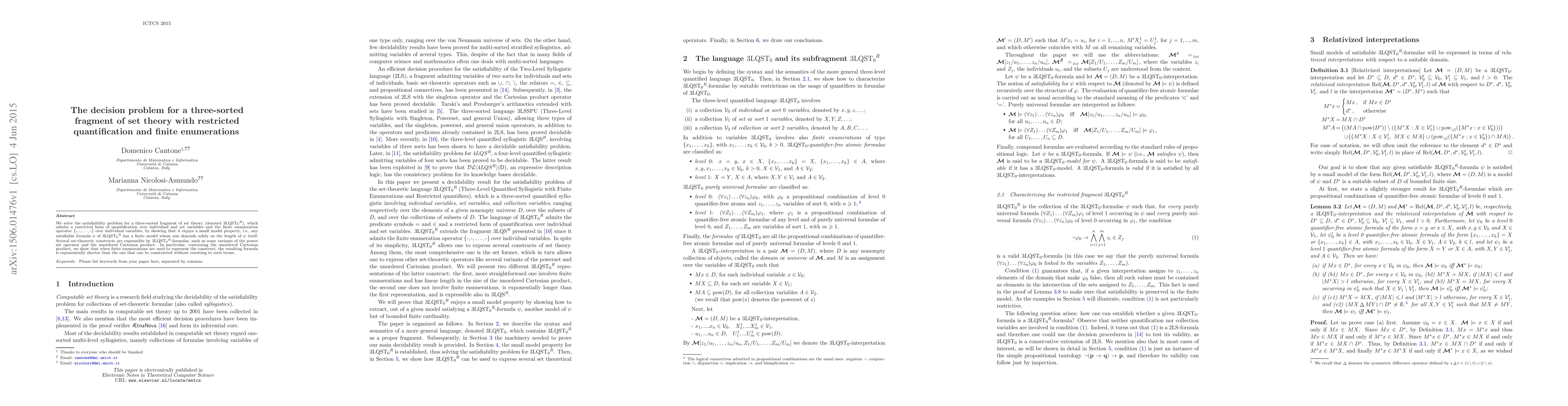 We solve the satisfiability problem for a three-sorted fragment of set theory (denoted $3LQST_0^R$), which admits a restricted form of quantification over individual and set variables and the finite enumeration operator $\{\text{-}, \text{-}, \ldots, \text{-}\}$ over individual variables, by showing that it enjoys a small model property, i.e., any satisfiable formula $\psi$ of $3LQST_0^R$ has a finite model whose size depends solely on the length of $\psi$ itself. Several set-theoretic constructs are expressible by $3LQST_0^R$-formulae, such as some variants of the power set operator and the unordered Cartesian product. In particular, concerning the unordered Cartesian product, we show that when finite enumerations are used to represent the construct, the resulting formula is exponentially shorter than the one that can be constructed without resorting to such terms.
