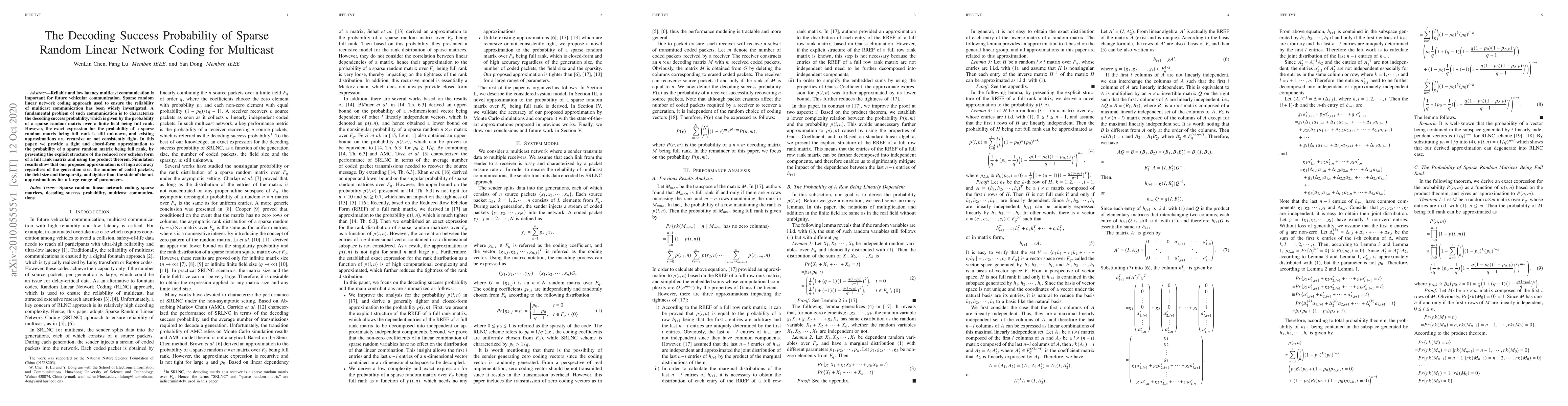 Reliable and low latency multicast communication is important for future vehicular communication. Sparse random linear network coding approach used to ensure the reliability of multicast communication has been widely investigated. A fundamental problem of such communication is to characterize the decoding success probability, which is given by the probability of a sparse random matrix over a finite field being full rank. However, the exact expression for the probability of a sparse random matrix being full rank is still unknown, and existing approximations are recursive or not consistently tight. In this paper, we provide a tight and closed-form approximation to the probability of a sparse random matrix being full rank, by presenting the explicit structure of the reduced row echelon form of a full rank matrix and using the product theorem. Simulation results show that our proposed approximation is of high accuracy regardless of the generation size, the number of coded packets, the field size and the sparsity, and tighter than the state-of-the-art approximations for a large range of parameters.