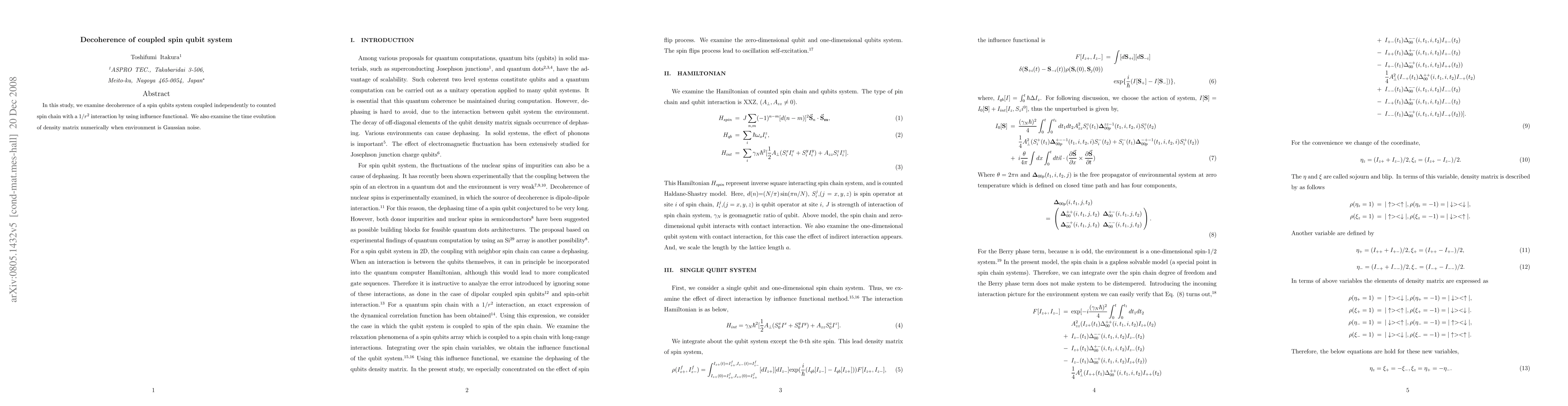 In this report, we examine the decoherence of a spin qubits system coupled to counted spin chain with a $1/r^2$ interaction by using influence functional. We also examine the time evolution of density matrix numerically when environment is Gaussian noise.