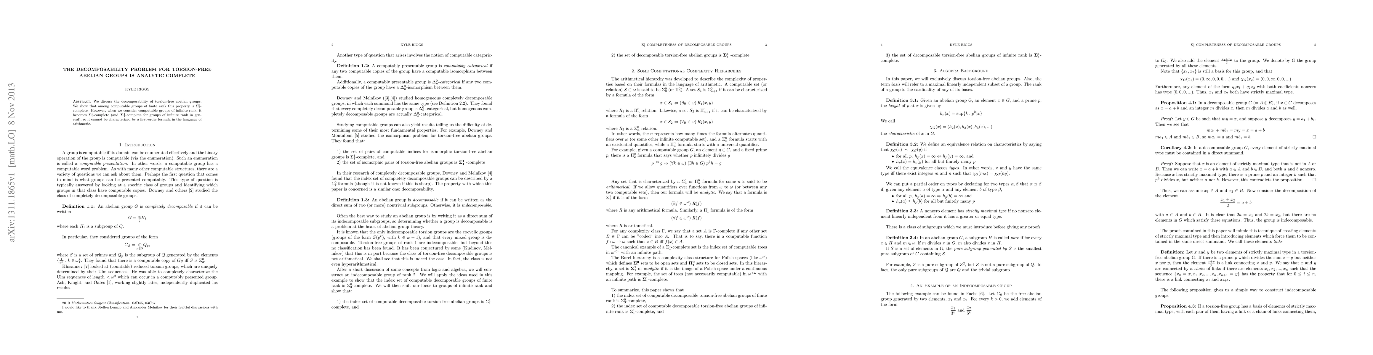 The decomposability problem for torsion-free abelian groups is shown to be $\Sigma^0_3$-complete among computable groups of finite rank, but becomes $\Sigma^1_1$-complete when considering infinite rank groups, indicating it cannot be characterized by a first-order formula in arithmetic.