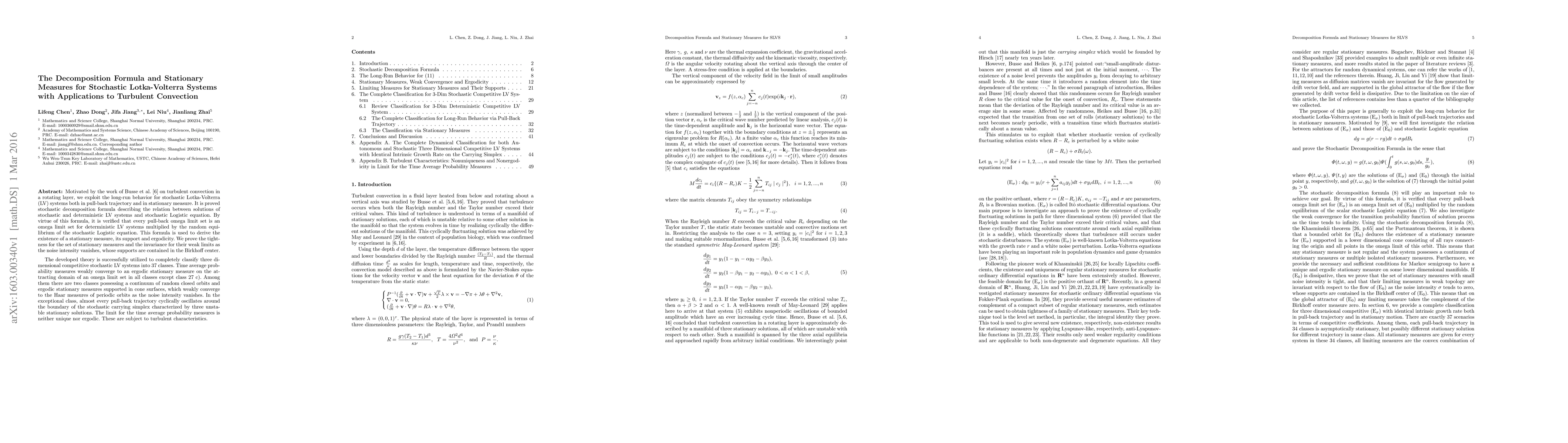 Motivated by the work of Busse et al. [6] on turbulent convection in a rotating layer, we exploit the long-run behavior for stochastic Lotka-Volterra (LV) systems both in pull-back trajectory and in stationary measure. It is proved stochastic decomposition formula describing the relation between solutions of stochastic and deterministic LV systems and stochastic Logistic equation. By virtue of this formula, it is verified that every pull-back omega limit set is an omega limit set for deterministic LV systems multiplied by the random equilibrium of the stochastic Logistic equation. This formula is used to derive the existence of a stationary measure, its support and ergodicity. We prove the tightness for the set of stationary measures and the invariance for their weak limits as the noise intensity vanishes, whose supports are contained in the Birkhoff center. The developed theory is successfully utilized to completely classify three dimensional competitive stochastic LV systems into $37$ classes. Time average probability measures weakly converge to an ergodic stationary measure on the attracting domain of an omega limit set in all classes except class 27 c). Among them there are two classes possessing a continuum of random closed orbits and ergodic stationary measures supported in cone surfaces, which weakly converge to the Haar measures of periodic orbits as the noise intensity vanishes. In the exceptional class, almost every pull-back trajectory cyclically oscillates around the boundary of the stochastic carrying simplex characterized by three unstable stationary solutions. The limit for the time average probability measures is neither unique nor ergodic. These are subject to turbulent characteristics.