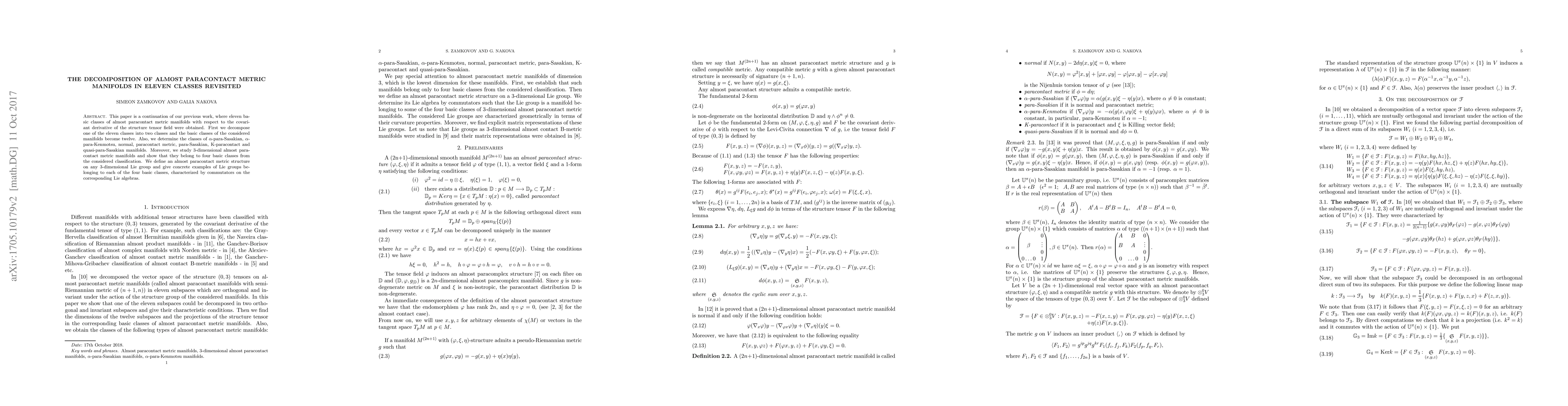 This paper is a continuation of our previous work, where eleven basic classes of almost paracontact metric manifolds with respect to the covariant derivative of the structure tensor field were obtained. First we decompose one of the eleven classes into two classes and the basic classes of the considered manifolds become twelve. Also, we determine the classes of $\alpha$-para-Sasakian, $\alpha$-para-Kenmotsu, normal, paracontact metric, para-Sasakian, K-paracontact and quasi-para-Sasakian manifolds. Moreover, we study 3-dimensional almost paracontact metric manifolds and show that they belong to four basic classes from the considered classification. We define an almost paracontact metric structure on any 3-dimensional Lie group and give concrete examples of Lie groups belonging to each of the four basic classes, characterized by commutators on the corresponding Lie algebras.
