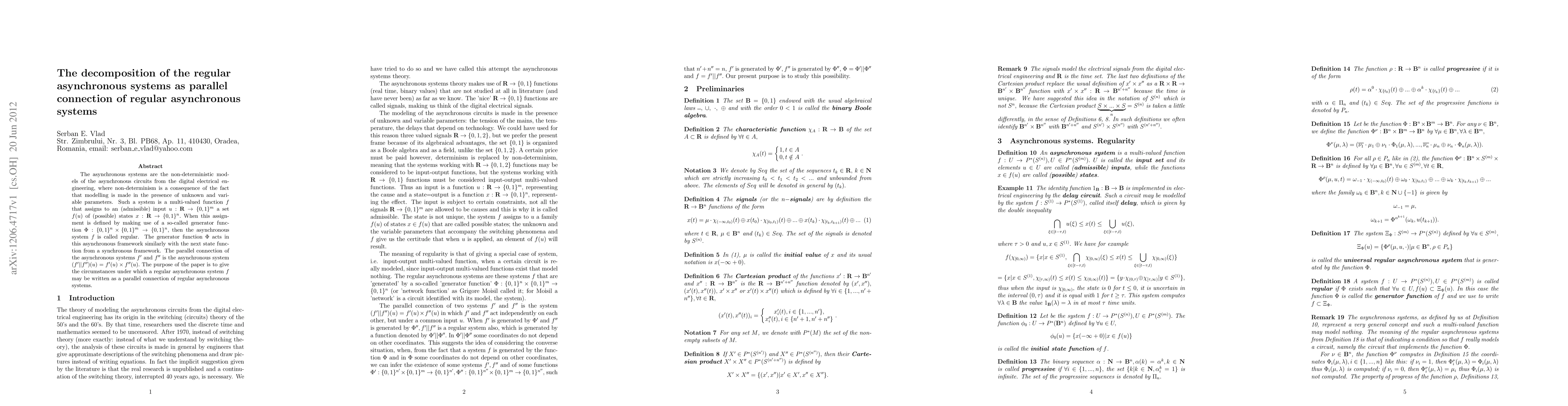 The asynchronous systems are the non-deterministic models of the asynchronous circuits from the digital electrical engineering, where non-determinism is a consequence of the fact that modelling is made in the presence of unknown and variable parameters. Such a system is a multi-valued function f that assigns to an (admissible) input u:R{\to}{0,1}^{m} a set f(u) of (possible) states x:R{\to}{0,1}^{n}. When this assignment is defined by making use of a so-called generator function {\Phi}:{0,1}^{n}{\times}{0,1}^{m}{\to}{0,1}^{n}, then the asynchronous system f is called regular. The generator function {\Phi} acts in this asynchronous framework similarly with the next state function from a synchronous framework. The parallel connection of the asynchronous systems f' and f" is the asynchronous system (f'||f")(u)=f'(u){\times}f"(u). The purpose of the paper is to give the circumstances under which a regular asynchronous system f may be written as a parallel connection of regular asynchronous systems.