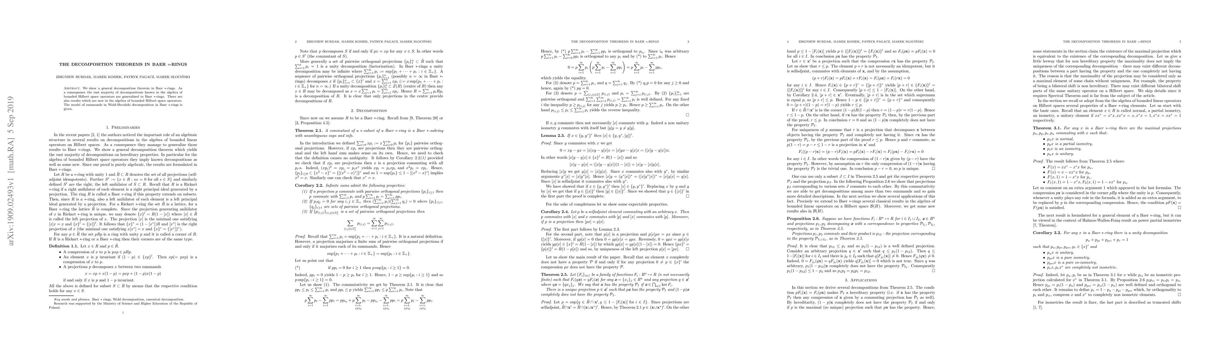 We show a general decomposition theorem in Baer *-rings. As a consequence the vast majority of decompositions known in the algebra of bounded Hilbert space operators are generalized to Baer *-rings. There are also results which are new in the algebra of bounded Hilbert space operators. The model of summands in Wold-S{\l}oci\'nski decomposition in Baer *-rings is given.