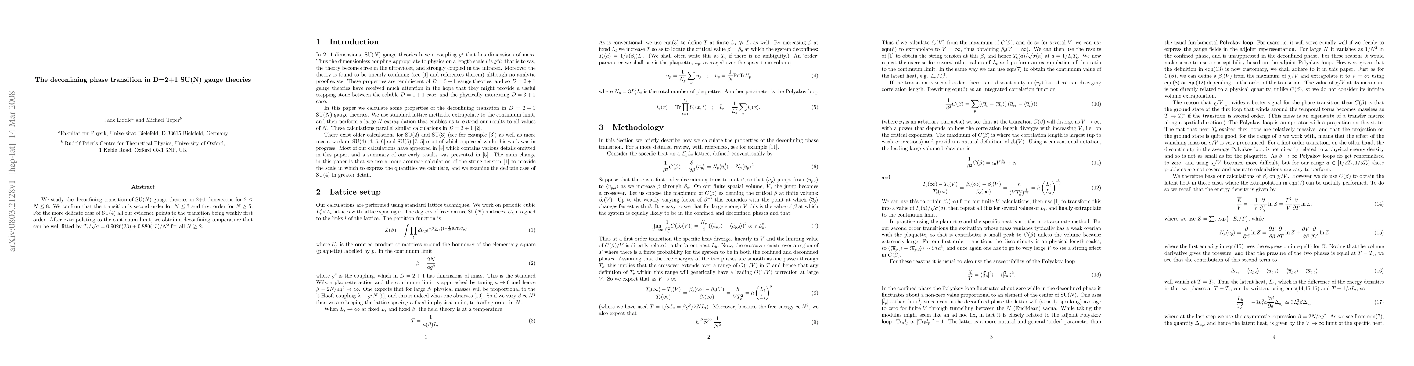 This paper investigates the deconfining phase transition in SU(N) gauge theories in 2+1 dimensions, finding second-order transitions for N<4 and first-order transitions for N>4, with SU(4) showing a weakly first-order transition. The extrapolated deconfining temperature is well-fitted by Tc/sqrt(sigma) = 0.9026(23) + 0.880(43)/N^2.