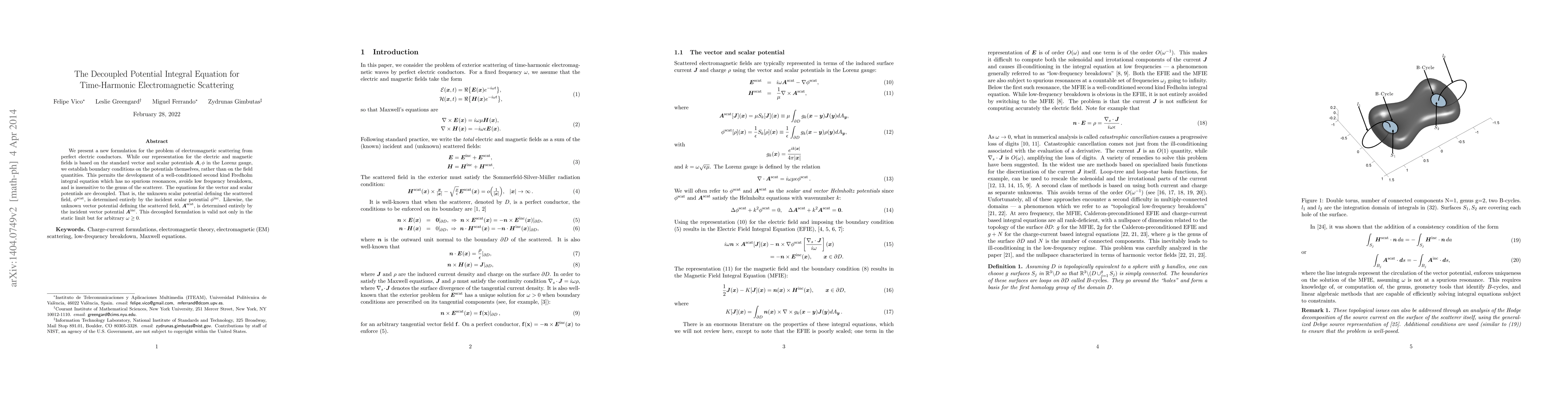 This paper introduces a new decoupled potential integral equation for electromagnetic scattering from perfect electric conductors, establishing boundary conditions on potentials rather than fields. The formulation results in a well-conditioned integral equation that avoids spurious resonances and low frequency breakdown, applicable for arbitrary frequencies.