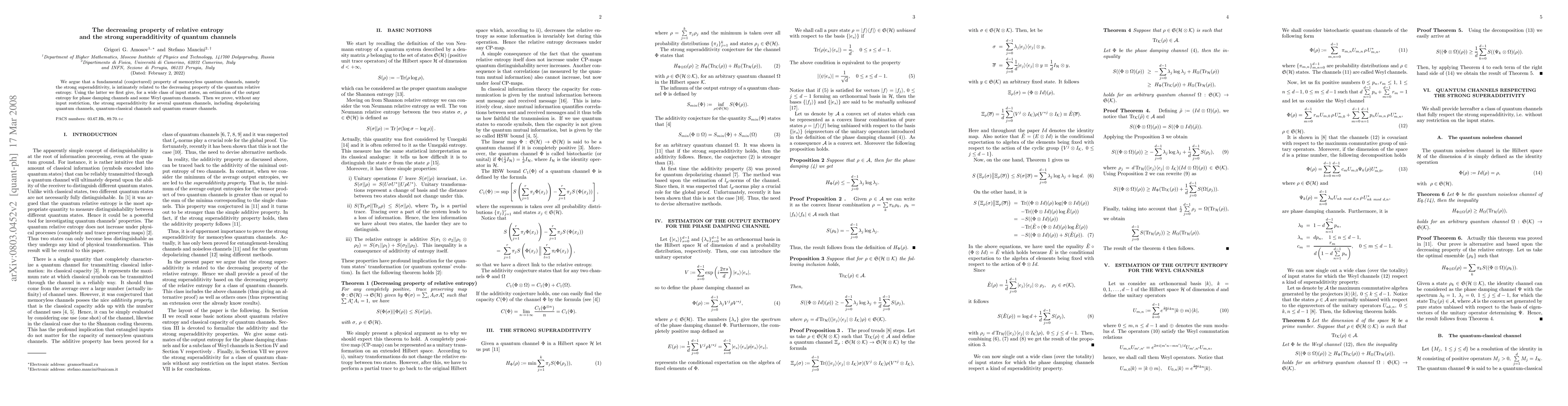 We argue that a fundamental (conjectured) property of memoryless quantum channels, namely the strong superadditivity, is intimately related to the decreasing property of the quantum relative entropy. Using the latter we first give, for a wide class of input states, an estimation of the output entropy for phase damping channels and some Weyl quantum channels. Then we prove, without any input restriction, the strong superadditivity for several quantum channels, including depolarizing quantum channels, quantum-classical channels and quantum erasure channels.