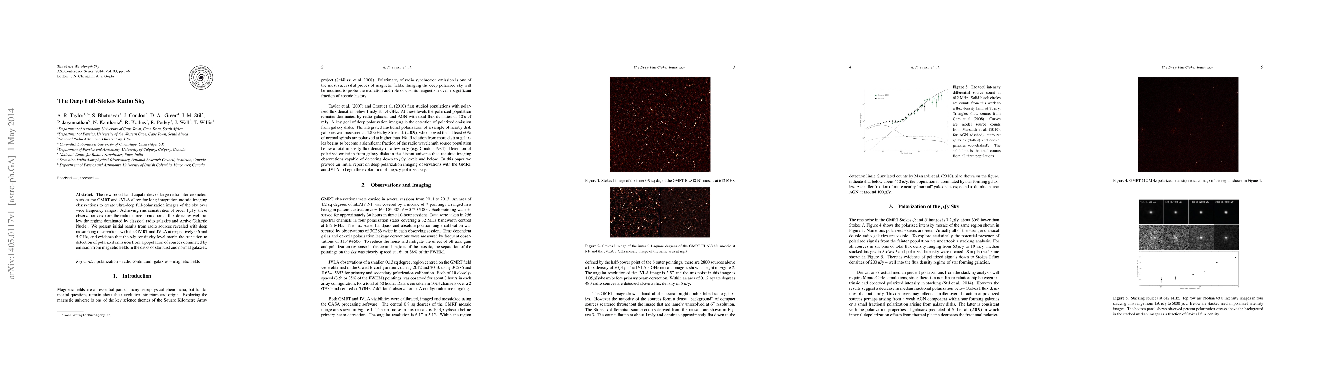 The new broad-band capabilities of large radio interferometers such as the GMRT and JVLA allow for long-integration mosaic imaging observations to create ultra-deep full-polarization images of the sky over wide frequency ranges. Achieving rms sensitivities of order 1 $\mu$Jy, these observations explore the radio source population at flux densities well below the regime dominated by classical radio galaxies and Active Galactic Nuclei. We present initial results from radio sources revealed with deep mosaicking observations with the GMRT and JVLA at respectively 0.6 and 5 GHz, and evidence that the $\mu$Jy sensitivity level marks the transition to detection of polarized emission from a population of sources dominated by emission from magnetic fields in the disks of starburst and normal galaxies.
