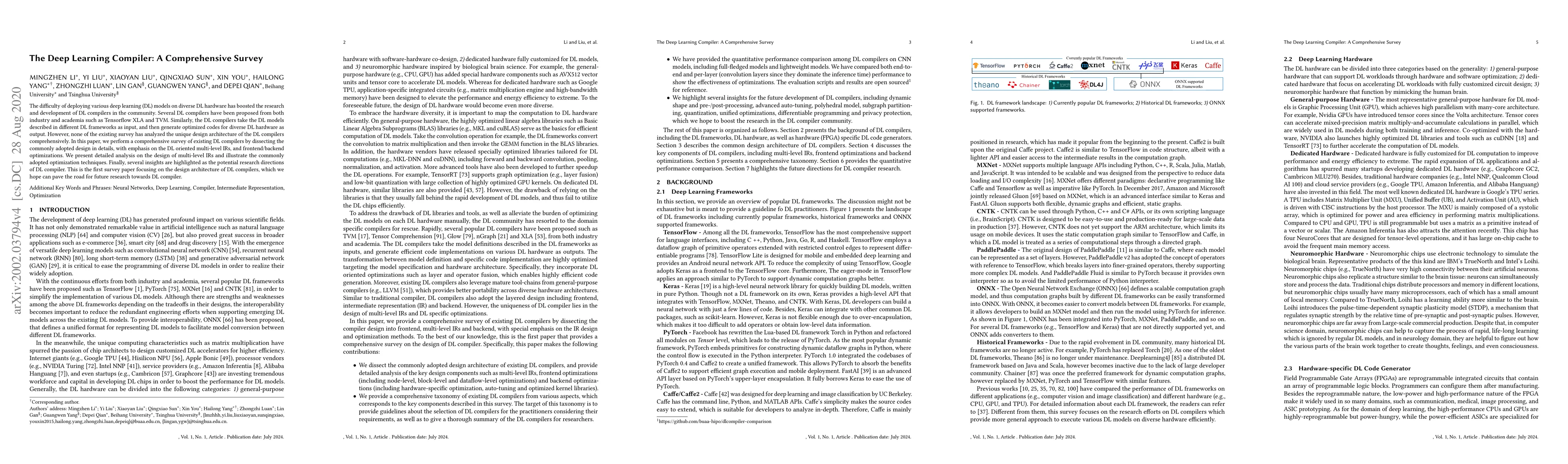 This paper conducts a comprehensive survey of deep learning (DL) compilers, dissecting their design architectures, focusing on multi-level intermediate representations (IRs) and optimization techniques. It provides a detailed comparison of existing compilers and highlights potential research directions for future development.