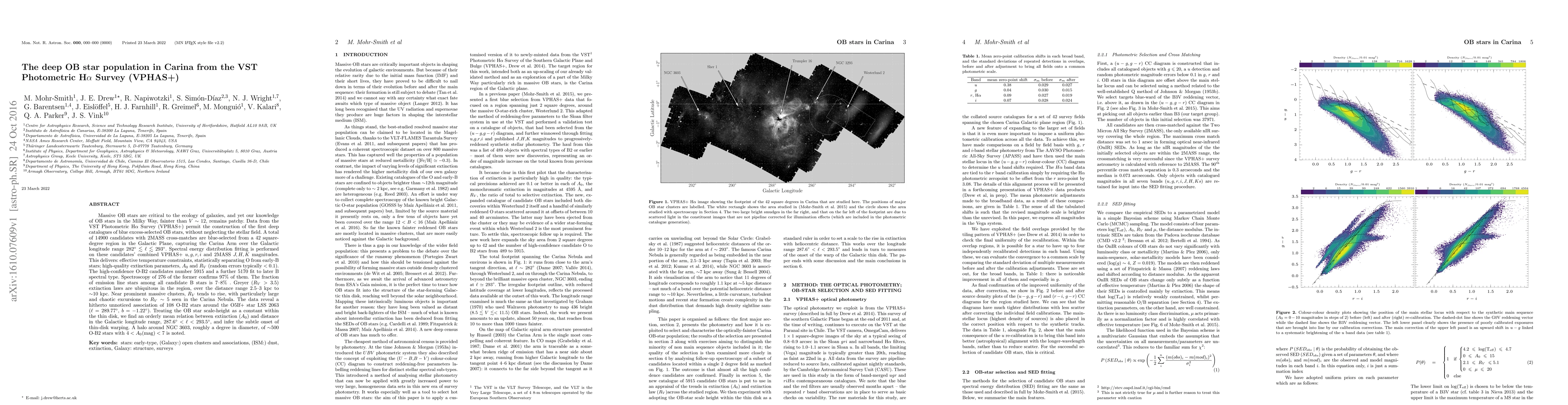 Massive OB stars are critical to the ecology of galaxies, and yet our knowledge of OB stars in the Milky Way, fainter than $V \sim 12$, remains patchy. Data from the VST Photometric H$\alpha$ Survey (VPHAS+) permit the construction of the first deep catalogues of blue excess-selected OB stars, without neglecting the stellar field. A total of 14900 candidates with 2MASS cross-matches are blue-selected from a 42 square-degree region in the Galactic Plane, capturing the Carina Arm over the Galactic longitude range $282^{\circ} \lesssim \ell \lesssim 293^{\circ}$. Spectral energy distribution fitting is performed on these candidates' combined VPHAS+ $u,g,r,i$ and 2MASS $J,H,K$ magnitudes. This delivers: effective temperature constraints, statistically separating O from early-B stars; high-quality extinction parameters, $A_0$ and $R_V$ (random errors typically $< 0.1$). The high-confidence O-B2 candidates number 5915 and a further 5170 fit to later B spectral type. Spectroscopy of 276 of the former confirms 97% of them. The fraction of emission line stars among all candidate B stars is 7--8% . Greyer ($R_V > 3.5$) extinction laws are ubiquitous in the region, over the distance range 2.5--3 kpc to $\sim$10~kpc. Near prominent massive clusters, $R_V$ tends to rise, with particularly large and chaotic excursions to $R_V \sim 5$ seen in the Carina Nebula. The data reveal a hitherto unnoticed association of 108 O-B2 stars around the O5If$+$ star LSS 2063 ($\ell = 289.77^{\circ}$, $b = -1.22^{\circ}$). Treating the OB star scale-height as a constant within the thin disk, we find an orderly mean relation between extinction ($A_0$) and distance in the Galactic longitude range, $287.6^{\circ} < \ell < 293.5^{\circ}$, and infer the subtle onset of thin-disk warping. A halo around NGC 3603, roughly a degree in diameter, of $\sim$500 O-B2 stars with $4 < A_0 (\rm{mag}) < 7$ is noted.