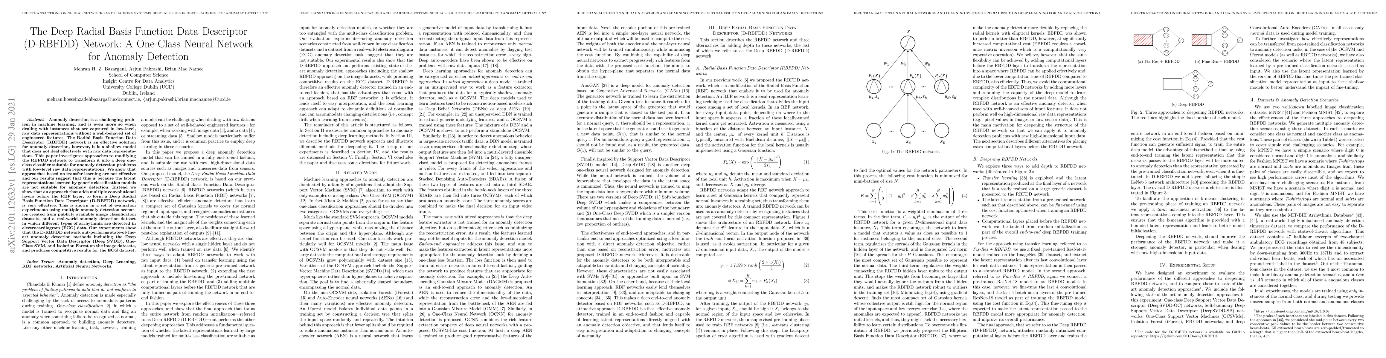 This paper proposes a Deep Radial Basis Function Data Descriptor (D-RBFDD) network, a deep one-class neural network for anomaly detection in raw data. The authors find that adding convolutional layers before the RBF layer enhances the model's performance, outperforming other state-of-the-art methods on image datasets and producing competitive results on ECG arrhythmia detection.