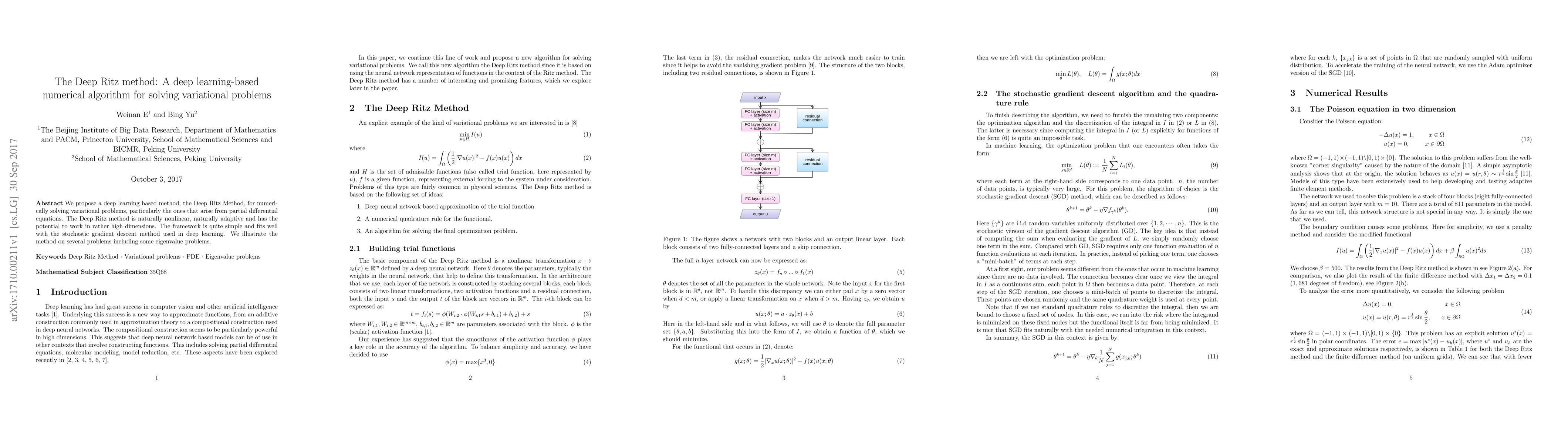 The Deep Ritz Method is a novel deep learning approach for solving variational problems, especially those derived from partial differential equations. It is inherently nonlinear, adaptive, and scalable to high dimensions, integrating seamlessly with stochastic gradient descent.