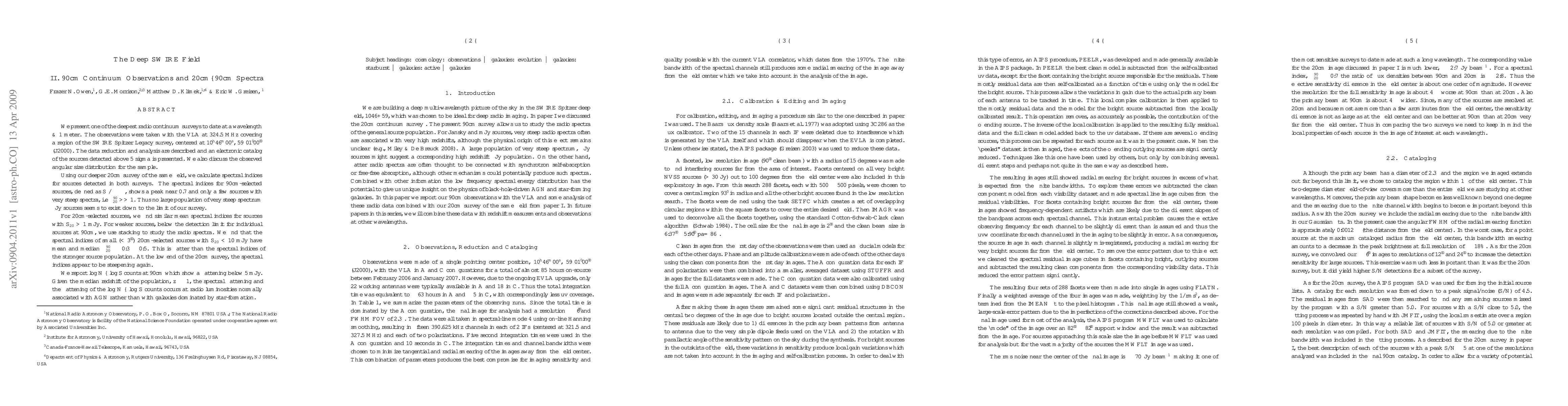 We present one of the deepest radio continuum surveys to date at a wavelength ~1 meter, at 324.5 MHz. The data reduction and analysis are described and an electronic catalog of the sources detected above 5 sigma is presented. We also discuss the observed angular size distribution for the sample. Using our deeper 20cm survey of the same field, we calculate spectral indices for sources detected in both surveys. The spectral indices for 90cm-selected sources, defined as S ~nu^(-alpha}, shows a peak near 0.7 and only a few sources with very steep spectra. Thus no large population of very steep spectrum microJy sources seems to exist down to the limit of our survey. For 20cm-selected sources, we find similar mean spectral indices for sources with S_20>1 mJy. For weaker sources, below the detection limit for individual sources at 90cm, we use stacking to study the radio spectra. We find that the spectral indices of small (<3") 20cm-selected sources with S_20< 10 mJy have mean and median alpha(90,20)~0.3-0.5. This is flatter than the spectral indices of the stronger source population. We report log N-log S counts at 90cm which show a flattening below 5 mJy. Given the median redshift of the population, z~1, the spectral flattening and the flattening of the log N-log S counts occurs at radio luminosities normally associated with AGN rather than with galaxies dominated by star-formation.