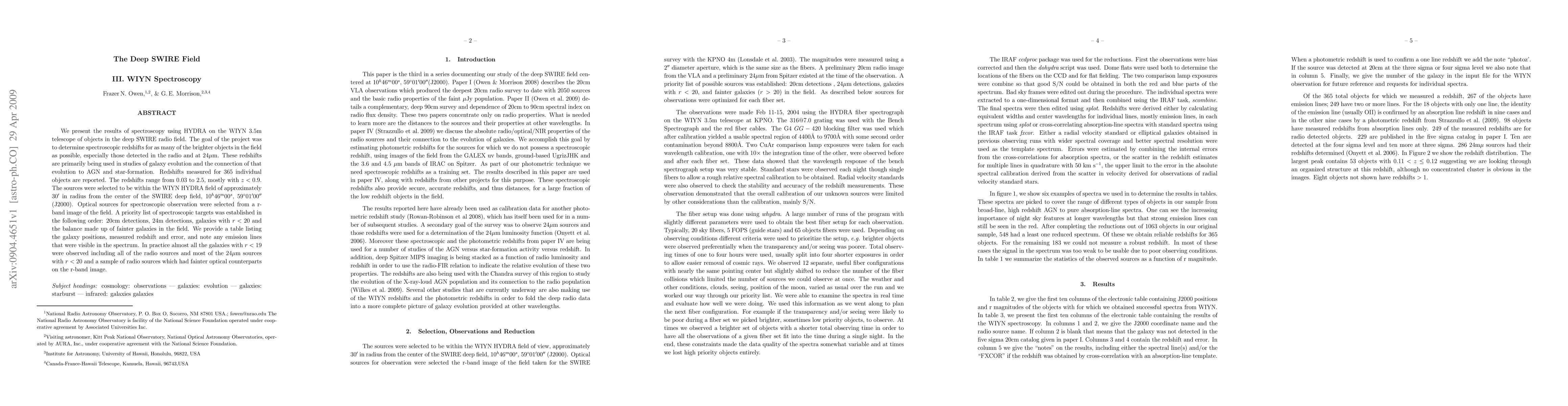 This paper reports on the spectroscopic redshifts of 365 objects in the deep SWIRE field using WIYN's HYDRA, with a focus on radio and 24 micron detections. The redshifts, ranging from 0.03 to 2.5, primarily aid studies of galaxy evolution and its connection to AGN and star-formation.