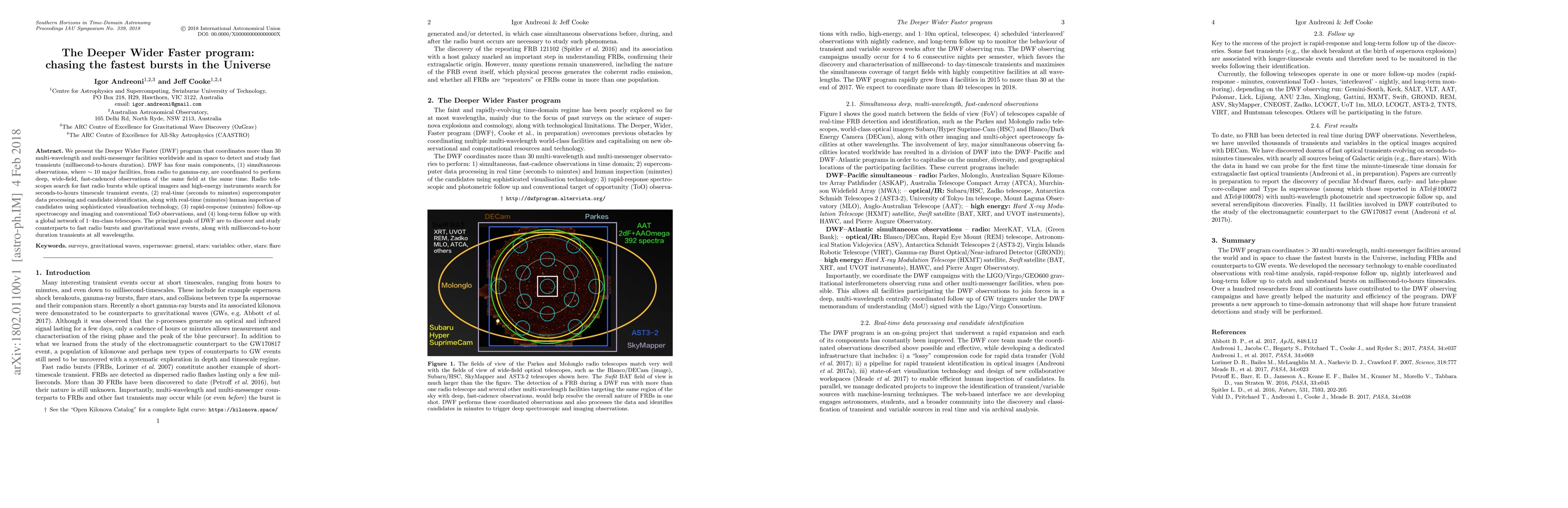 The Deeper Wider Faster (DWF) program coordinates over 30 global facilities to detect and study fast transients, employing simultaneous observations, real-time data processing, rapid-response follow-ups, and long-term follow-ups to discover counterparts to fast radio bursts and gravitational wave events.