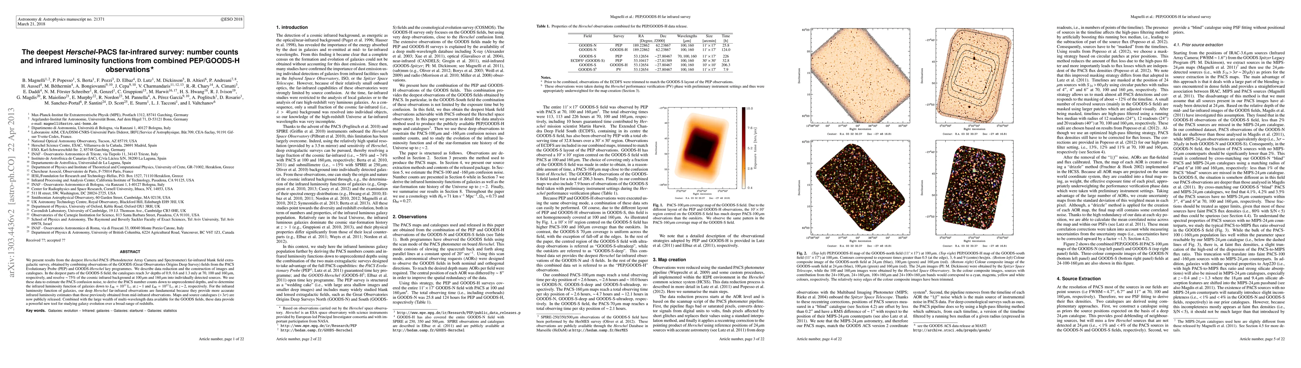 This paper presents the deepest Herschel-PACS far-infrared survey combining PEP and GOODS-H observations, revealing the PACS number counts and infrared luminosity functions of galaxies. The survey resolves ~75% of the cosmic infrared background into individually detected sources, providing more accurate infrared luminosity estimates than previous mid-infrared observations.