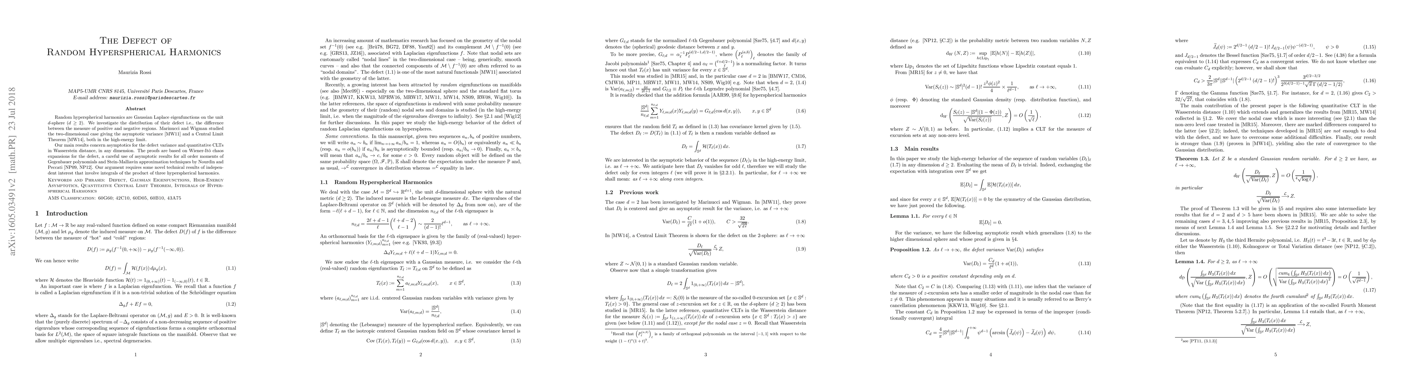 This paper investigates the distribution of the defect in random hyperspherical harmonics, focusing on the difference between the measure of positive and negative regions. It extends previous results by Marinucci and Wigman to higher dimensions, providing asymptotic variance and quantitative Central Limit Theorems in Wasserstein distance, utilizing Wiener-Itô chaos expansions and novel technical results involving integrals of hyperspherical harmonics.