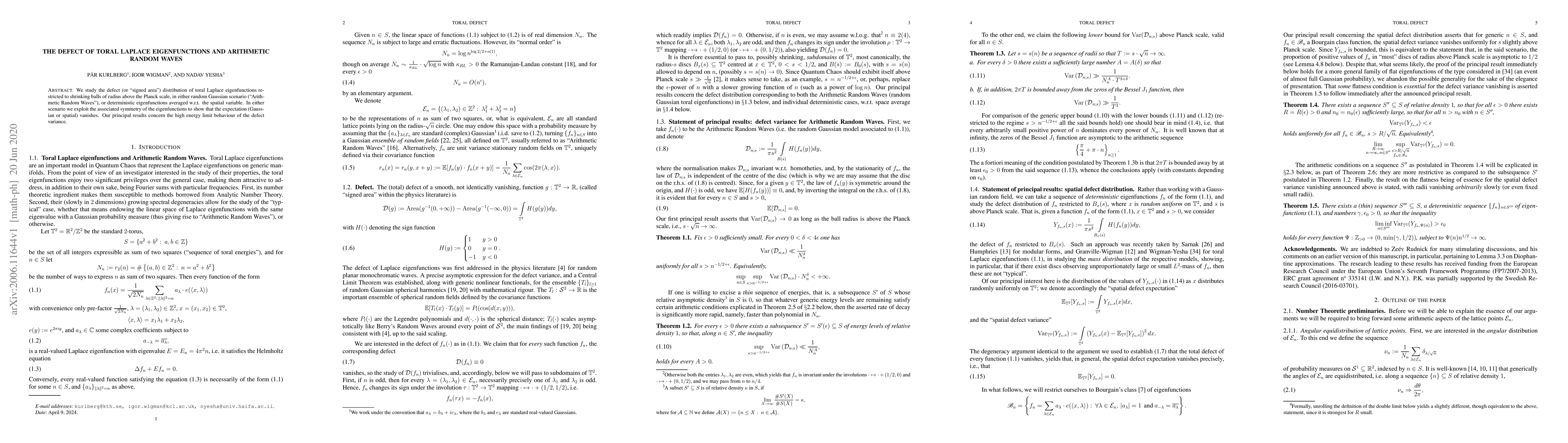 This paper investigates the defect distribution of toral Laplace eigenfunctions under Gaussian random scenarios and deterministic averaging, demonstrating that the expectation vanishes. The main focus is on the variance of the defect in the high energy limit.