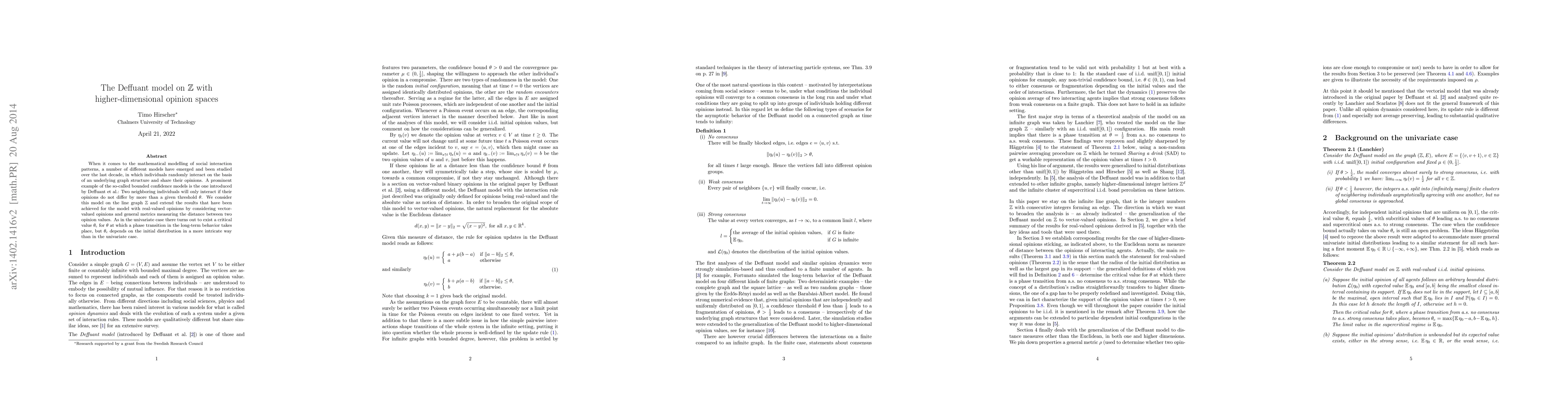 When it comes to the mathematical modelling of social interaction patterns, a number of different models have emerged and been studied over the last decade, in which individuals randomly interact on the basis of an underlying graph structure and share their opinions. A prominent example of the so-called bounded confidence models is the one introduced by Deffuant et al.: Two neighboring individuals will only interact if their opinions do not differ by more than a given threshold $\theta$. We consider this model on the line graph $\mathbb{Z}$ and extend the results that have been achieved for the model with real-valued opinions by considering vector-valued opinions and general metrics measuring the distance between two opinion values. Just as in the univariate case, there exists a critical value for $\theta$ at which a phase transition in the long-term behavior takes place.
