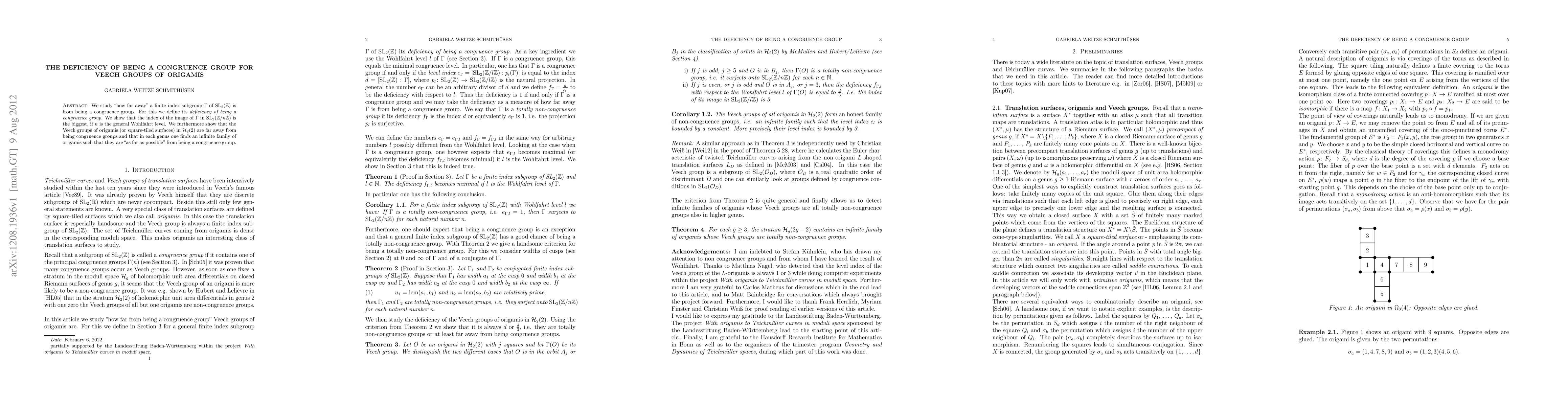 Summary: This paper investigates the extent to which finite index subgroups of SL(2,Z) deviate from being congruence groups, defining a measure of this deficiency. It finds that Veech groups of origamis in the stratum H(2) are maximally distant from being congruence groups, with specific origamis in each genus exemplifying this maximal deficiency.