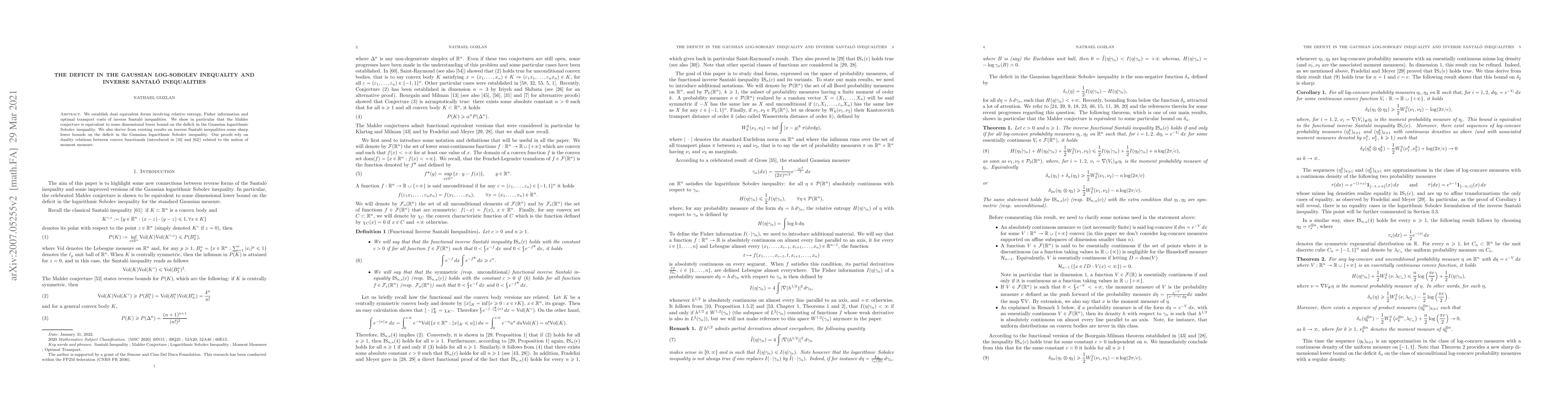 We establish dual equivalent forms involving relative entropy, Fisher information and optimal transport costs of inverse Santal{\'o} inequalities. We show in particular that the Mahler conjecture is equivalent to some dimensional lower bound on the deficit in the Gaussian logarithmic Sobolev inequality. We also derive from existing results on inverse Santal{\'o} inequalities some sharp lower bounds on the deficit in the Gaussian logarithmic Sobolev inequality.