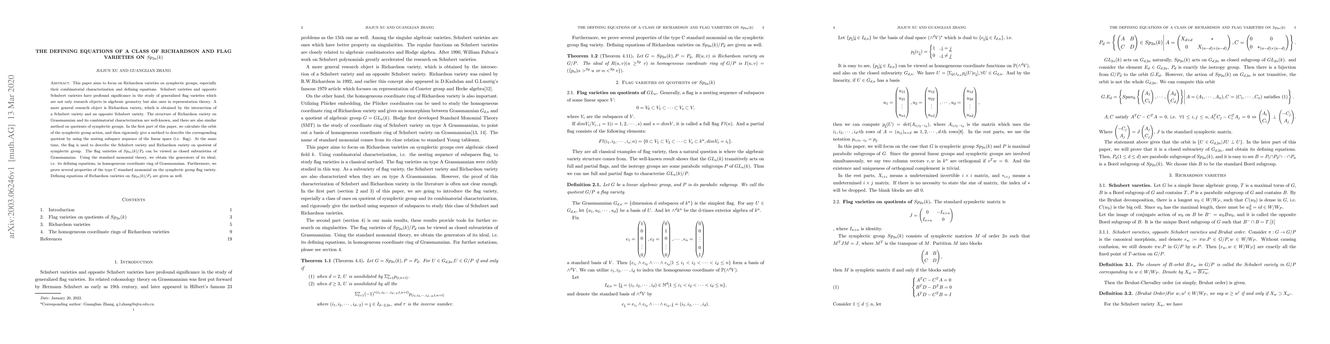 This paper investigates Richardson and flag varieties in the symplectic group Sp$_{2n}(k)$, focusing on their combinatorial characterization and defining equations. It employs the nesting subspace sequence of linear spaces (flags) to describe these varieties and uses standard monomial theory to derive their defining equations in the homogeneous coordinate ring of Grassmannian.