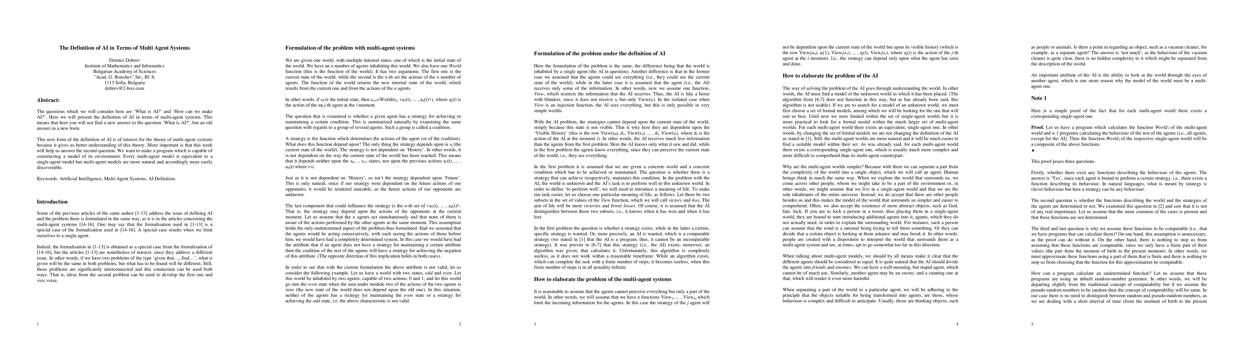 The questions which we will consider here are "What is AI?" and "How can we make AI?". Here we will present the definition of AI in terms of multi-agent systems. This means that here you will not find a new answer to the question "What is AI?", but an old answer in a new form. This new form of the definition of AI is of interest for the theory of multi-agent systems because it gives us better understanding of this theory. More important is that this work will help us answer the second question. We want to make a program which is capable of constructing a model of its environment. Every multi-agent model is equivalent to a single-agent model but multi-agent models are more natural and accordingly more easily discoverable.