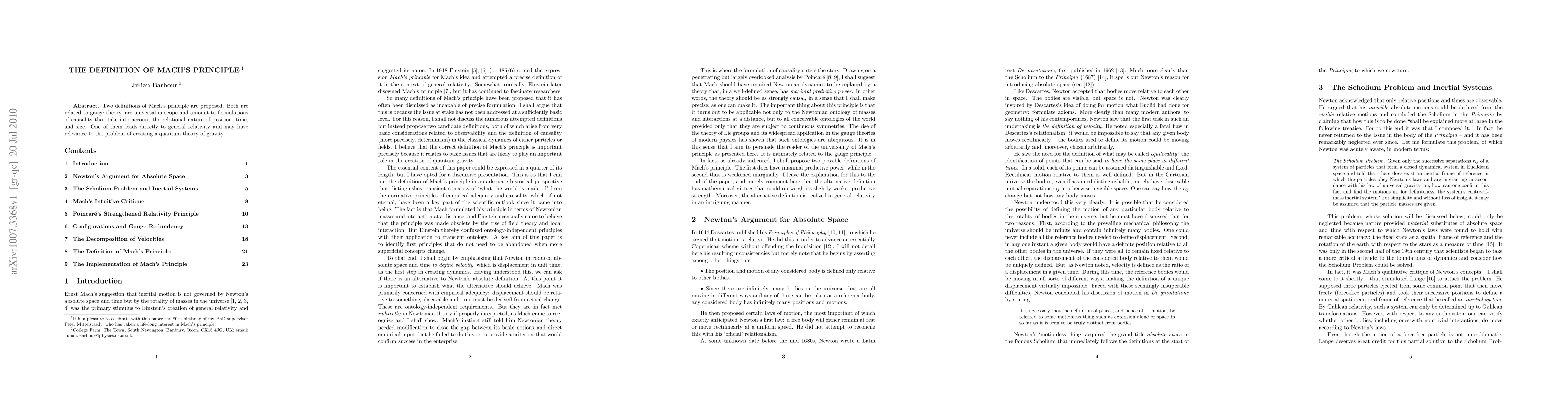 Two definitions of Mach's principle are proposed. Both are related to gauge theory, are universal in scope and amount to formulations of causality that take into account the relational nature of position, time, and size. One of them leads directly to general relativity and may have relevance to the problem of creating a quantum theory of gravity.
