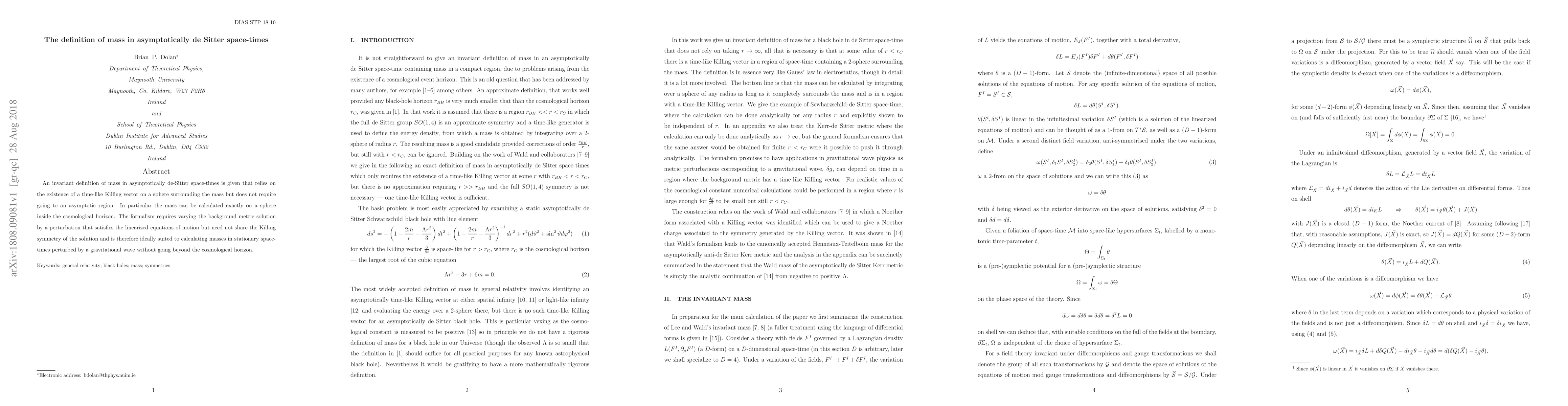 An invariant definition of mass in asymptotically de-Sitter space-times is given that relies on the existence of a time-like Killing vector on a sphere surrounding the mass but does not require going to an asymptotic region. In particular the mass can be calculated exactly on a sphere inside the cosmological horizon. The formalism requires varying the background metric solution by a perturbation that satisfies the linearized equations of motion but need not share the Killing symmetry of the solution and is therefore ideally suited to calculating masses in stationary space-times perturbed by a gravitational wave without going beyond the cosmological horizon.