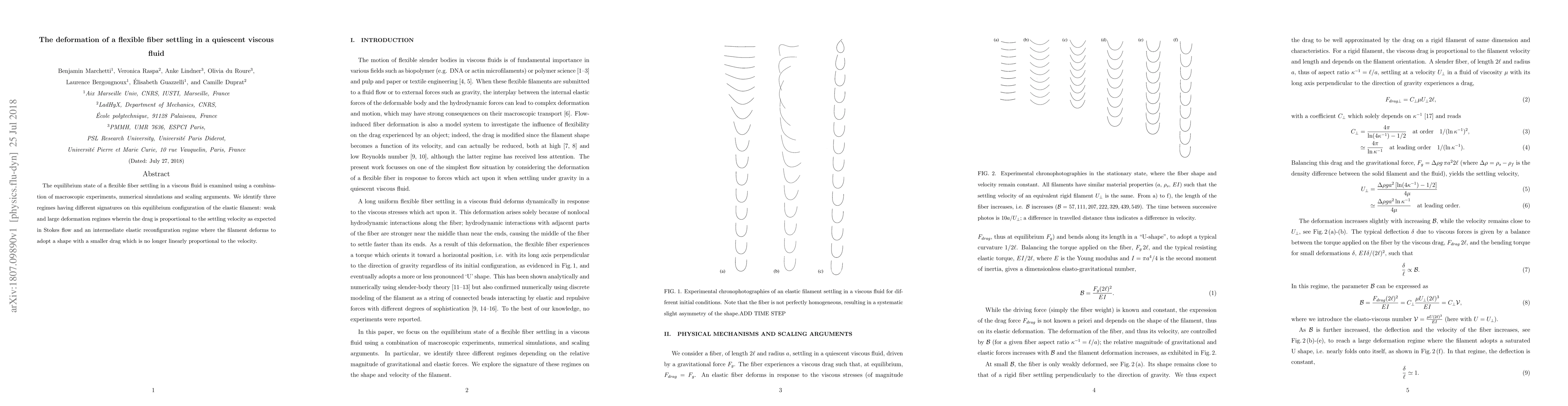 This study investigates the equilibrium deformation of a flexible fiber in a viscous fluid, identifying three distinct regimes: weak and large deformations where drag is proportional to velocity, and an intermediate regime where elastic reconfiguration reduces drag in a non-linear manner. The findings combine experimental, numerical, and theoretical approaches.