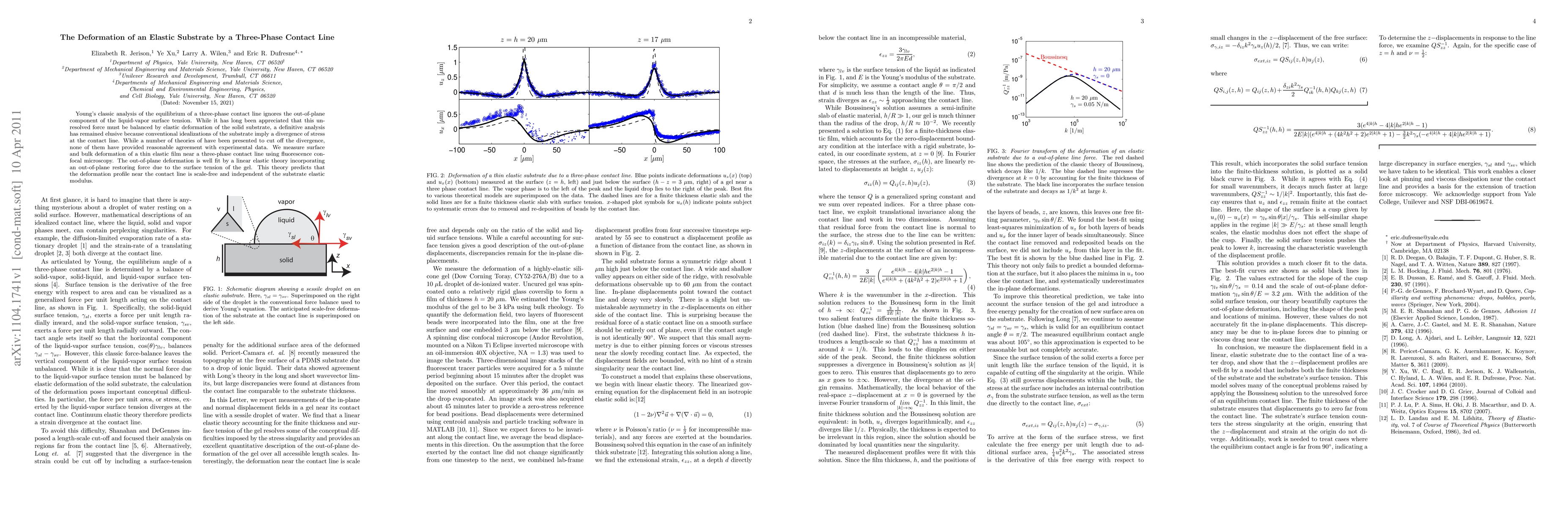 Young's classic analysis of the equilibrium of a three-phase contact line ignores the out-of-plane component of the liquid-vapor surface tension. While it has long been appreciated that this unresolved force must be balanced by elastic deformation of the solid substrate, a definitive analysis has remained elusive because conventional idealizations of the substrate imply a divergence of stress at the contact line. While a number of theories of have been presented to cut off the divergence, none of them have provided reasonable agreement with experimental data. We measure surface and bulk deformation of a thin elastic film near a three-phase contact line using fluorescence confocal microscopy. The out-of-plane deformation is well fit by a linear elastic theory incorporating an out-of-plane restoring force due to the surface tension of the gel. This theory predicts that the deformation profile near the contact line is scale-free and independent of the substrate elastic modulus.