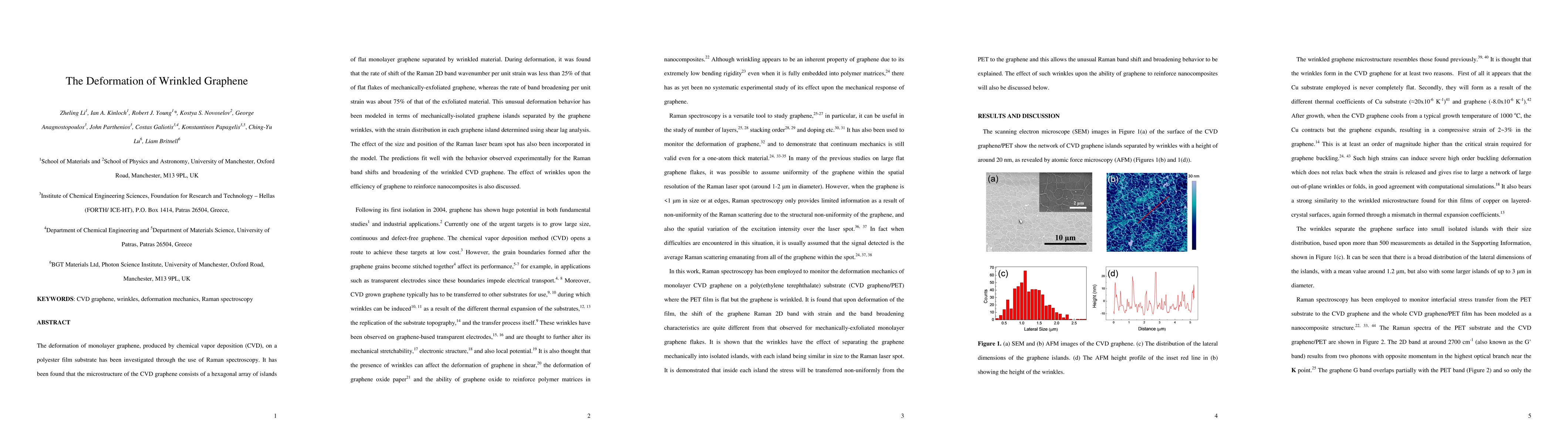 This study investigates the deformation behavior of wrinkled graphene produced via chemical vapor deposition on polyester films, revealing that its mechanical response differs from that of mechanically-exfoliated graphene due to the presence of graphene wrinkles. The model developed to explain the observed Raman spectroscopy results fits well with experimental observations, suggesting that wrinkles may impact graphene's reinforcing efficiency in nanocomposites.