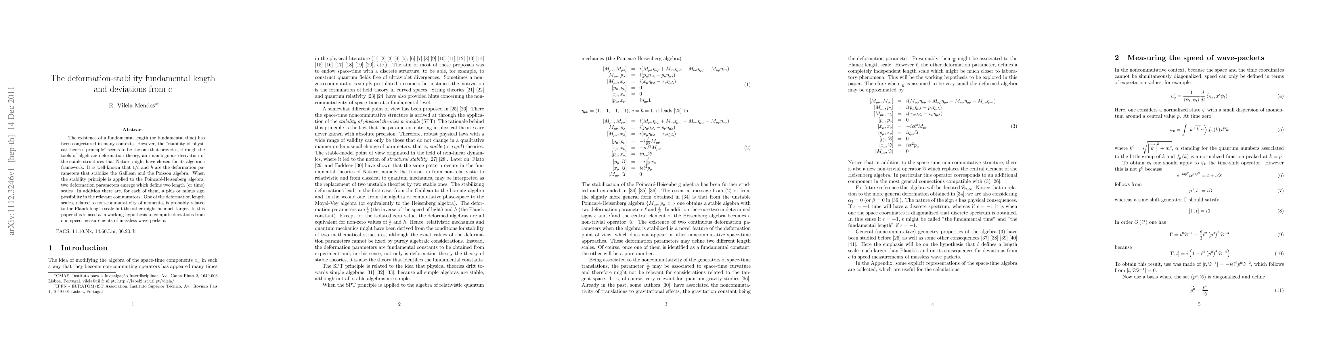 The existence of a fundamental length (or fundamental time) has been conjectured in many contexts. However, the "stability of physical theories principle" seems to be the one that provides, through the tools of algebraic deformation theory, an unambiguous derivation of the stable structures that Nature might have chosen for its algebraic framework. It is well-known that $1/c$ and $\hbar $ are the deformation parameters that stabilize the Galilean and the Poisson algebra. When the stability principle is applied to the Poincar\'{e}-Heisenberg algebra, two deformation parameters emerge which define two length (or time) scales. In addition there are, for each of them, a plus or minus sign possibility in the relevant commutators. One of the deformation length scales, related to non-commutativity of momenta, is probably related to the Planck length scale but the other might be much larger. In this paper this is used as a working hypothesis to compute deviations from $c$ in speed measurements of massless wave packets.