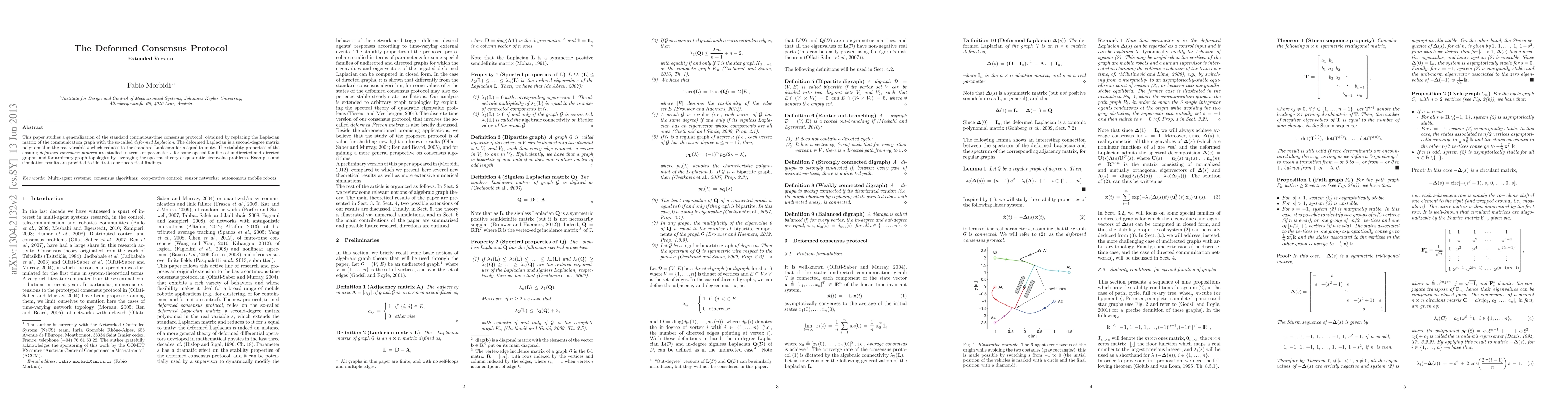 This paper studies a modified consensus protocol that uses a deformed Laplacian matrix, which is studied for its stability properties across different graph topologies.