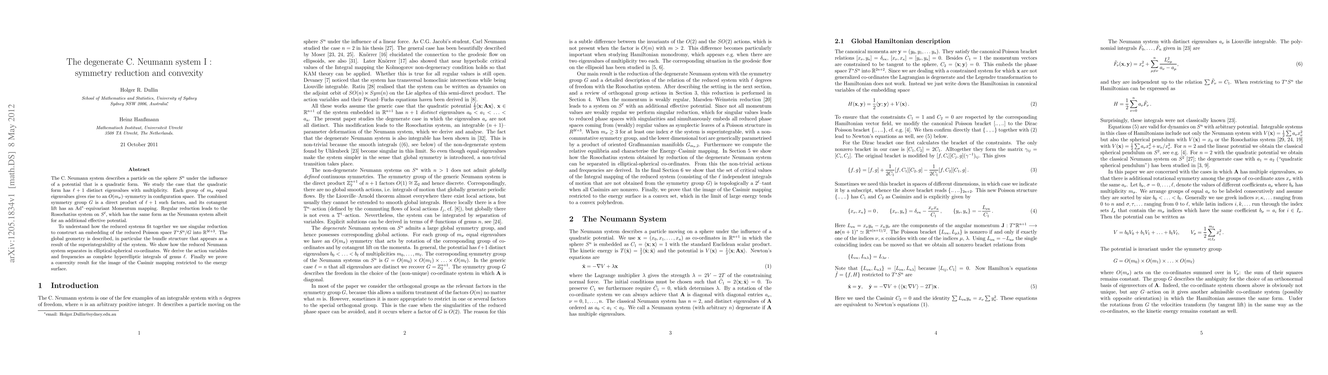 The C. Neumann system describes a particle on the sphere S^n under the influence of a potential that is a quadratic form. We study the case that the quadratic form has l+1 distinct eigenvalues with multiplicity. Each group of m_\sigma equal eigenvalues gives rise to an O(m_\sigma)-symmetry in configuration space. The combined symmetry group G is a direct product of l+1 such factors, and its cotangent lift has an Ad^*-equivariant Momentum mapping. Regular reduction leads to the Rosochatius system on S^l, which has the same form as the Neumann system albeit for an additional effective potential. To understand how the reduced systems fit together we use singular reduction to construct an embedding of the reduced Poisson space T^*{S^n}/G into R^{3l+3}$. The global geometry is described, in particular the bundle structure that appears as a result of the superintegrability of the system. We show how the reduced Neumann system separates in elliptical-spherical co-ordinates. We derive the action variables and frequencies as complete hyperelliptic integrals of genus l. Finally we prove a convexity result for the image of the Casimir mapping restricted to the energy surface.