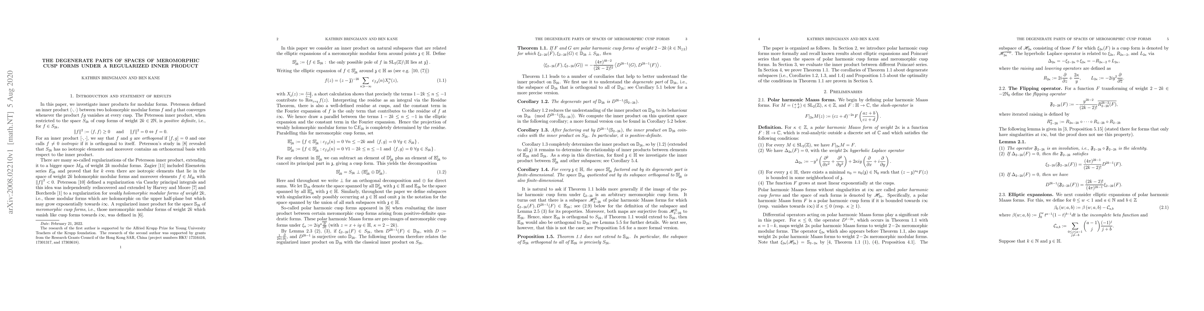 This paper investigates inner product relationships between meromorphic modular forms from distinguished subspaces, focusing on degenerate parts and quotient spaces, with implications for understanding these forms' properties.