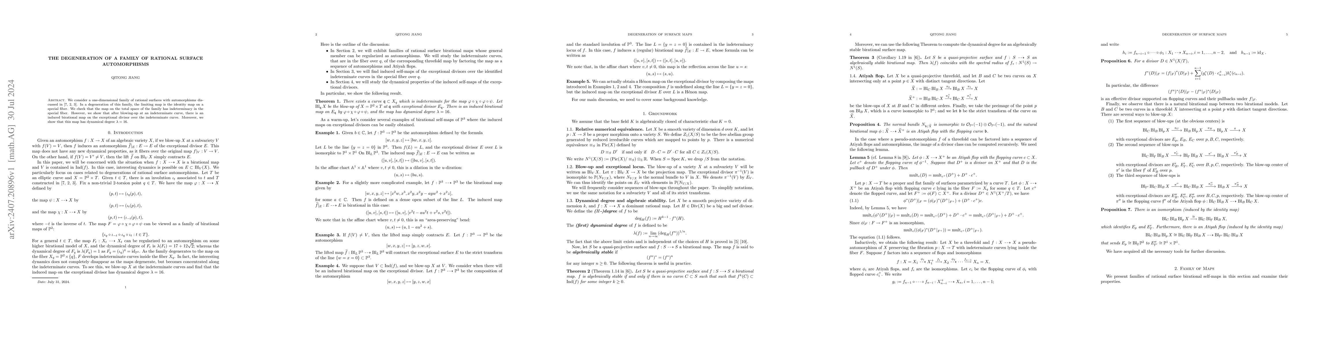 This paper investigates a family of rational surfaces with automorphisms, demonstrating degeneration to an identity map on a special fiber, and proving that after blowing up at an indeterminate curve, a birational map on the exceptional divisor emerges with a dynamical degree of 16.