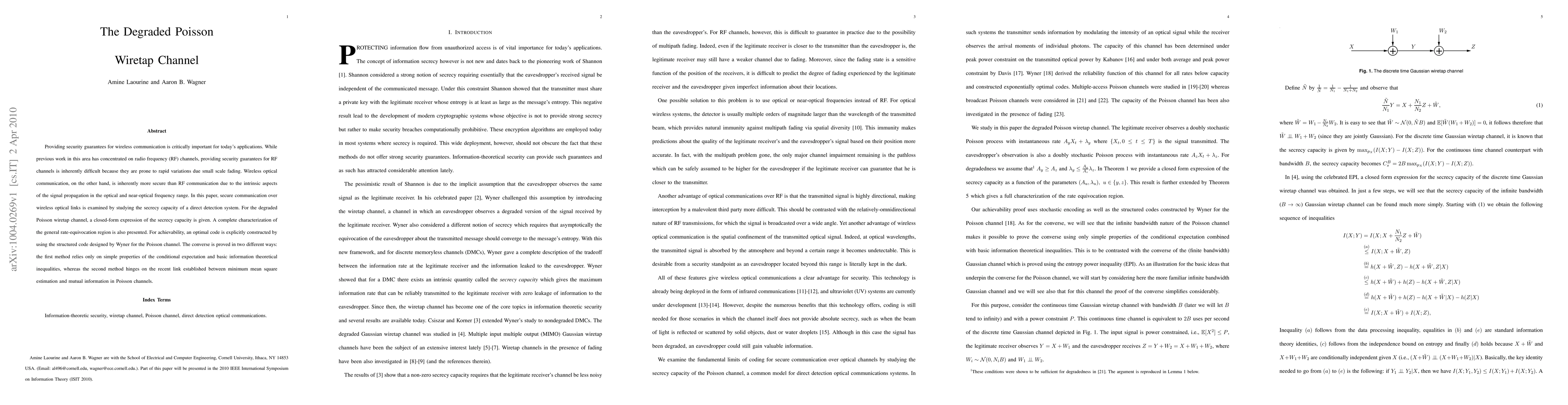 This paper investigates secure communication over wireless optical links, focusing on the degraded Poisson wiretap channel. It provides a closed-form expression for the secrecy capacity and a complete characterization of the rate-equivocation region, using structured codes and proving the converse through information-theoretic inequalities and a link between estimation and mutual information.
