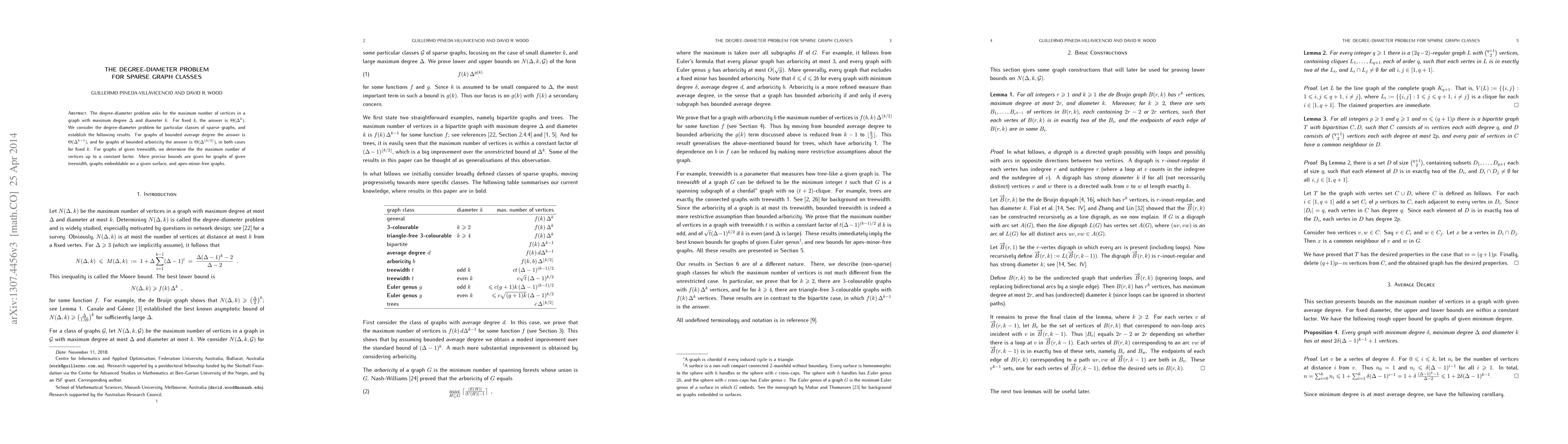The paper investigates the degree-diameter problem for specific sparse graph classes, establishing bounds on the maximum number of vertices in terms of degree and diameter.