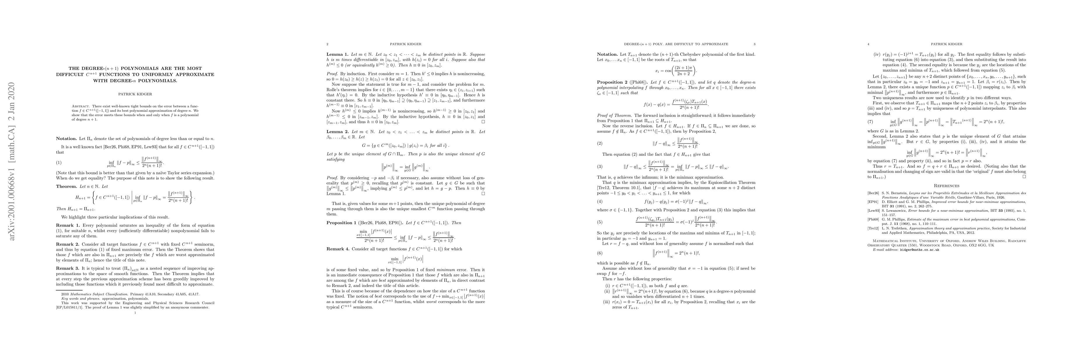 There exist well-known tight bounds on the error between a function $f \in C^{\,n + 1}([-1, 1])$ and its best polynomial approximation of degree $n$. We show that the error meets these bounds when and only when $f$ is a polynomial of degree $n + 1$.